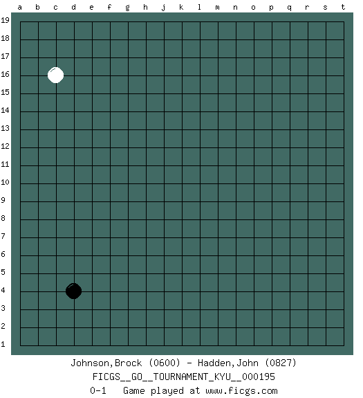Last move : 0-1 2019 June 7 14:16:4 [Event "FICGS__GO__TOURNAMENT_KYU__000195"] [Site "FICGS"] [Date "2019.05.05"] [Round "1"] [Black "Johnson,Brock"] [White "Hadden,John"] [Result "0-1"] [Rating 1 "0600"] [Rating 2 "0827"] 1.d4 c16 0-1 This go game has been lost on time (started : 2019.05.05 20:17:45) Here are the names of the openings (joseki) played in the four corners : Player White won this Go (weiqi, baduk) game. Follow this game move after move (download)Avoid the plate connection. (Anonymous) Luck is the residue of design. (John Milton)