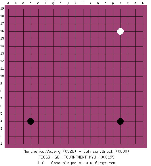 Last move : 1-0 2019 June 7 14:16:4 [Event "FICGS__GO__TOURNAMENT_KYU__000195"] [Site "FICGS"] [Date "2019.05.05"] [Round "1"] [Black "Nemchenko,Valery"] [White "Johnson,Brock"] [Result "1-0"] [Rating 1 "0926"] [Rating 2 "0600"] 1.d4 q16 2.q4 1-0 This go game has been lost on time (started : 2019.05.05 20:17:45) Here are the names of the openings (joseki) played in the four corners : Corner q4 : q4 1-0 Hoshi (Hwajeom, Seongjeom, Xingwei`) 4-4 Point. The star or hoshi (4-4) point, emphasizing influence at the potential expense of territory. Player Black won this Go (weiqi, baduk) game. Follow this game move after move (download)Josekis are not fixed, definitive things. They indicate the moments when everything can change. (Pierre Audouard) Remember : Your focus determines your reality. (Qui-Gon Jinn in Star Wars ep.1)