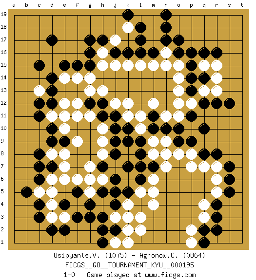 Last move : 1-0 2019 July 26 15:39:58 [Event "FICGS__GO__TOURNAMENT_KYU__000195"] [Site "FICGS"] [Date "2019.05.05"] [Round "1"] [Black "Osipyants,Vladimir"] [White "Agronow,Cosmo"] [Result "1-0"] [Rating 1 "1075"] [Rating 2 "0864"] 1.q16 d4 2.d17 q4 3.c15 r14 4.q12 e14 5.g17 j15 6.o17 o15 7.q14 q15 8.p15 r15 9.p14 o11 10.q10 p8 11.r16 q13 12.p13 r13 13.r12 p12 14.o16 o12 15.s12 o14 16.q8 q7 17.p9 p7 18.o9 n9 19.r3 q3 20.r4 r5 21.s5 r6 22.s6 c13 23.c8 d8 24.c7 d6 25.d7 e7 26.c6 d5 27.k3 k4 28.j4 j17 29.j5 j7 30.g15 g14 31.d9 e8 32.e9 f9 33.n8 o8 34.n10 m9 35.o10 n11 36.m10 l10 37.l9 m8 38.l8 n7 39.m7 n8 40.l6 m6 41.l7 l5 42.l4 m5 43.k5 k6 44.k10 l11 45.j9 k8 46.k9 k11 47.h7 h8 48.j8 o13 49.p16 h9 50.j11 j12 51.h11 h10 52.j10 g11 53.h12 h13 54.g12 f12 55.k7 g13 56.j6 m4 57.m11 m12 58.r8 r7 59.s7 l3 60.f3 g5 61.g4 f4 62.g3 g7 63.h5 g6 64.c11 d11 65.d10 e10 66.e11 f11 67.d12 e12 68.d13 d11 69.c12 e11 70.d14 k12 71.m16 m15 72.l16 l15 73.k16 k15 74.j16 h16 75.h17 h15 76.g16 n16 77.n17 n15 78.q2 p2 79.r2 p1 80.q1 l2 81.c3 e3 82.c4 c5 83.b5 k2 84.j2 j1 85.h1 k1 86.h2 k4 87.e2 d3 88.d2 j3 89.f5 e6 90.e4 f6 91.e15 f14 92.f15 h6 93.h3 k3 94.p11 m17 95.l17 m18 96.l18 l19 97.n18 m19 98.k19 k18 99.n19 1-0 Here are the names of the openings (joseki) played in the four corners : Corner q16 : q16 r14 Hoshi (Hwajeom, Seongjeom, Xingwei`) 4-4 Point. The star or hoshi (4-4) point, emphasizing influence at the potential expense of territory. Ikken Kakari (Hankan Keolch'im, Yi Gua`jiao~, 1-Space Low Approach). White 2 is the standard approach move to the 4-4. Corner d4 : d4 c8 Hoshi (Hwajeom, Seongjeom, Xingwei`) 4-4 Point. The star or hoshi (4-4) point, emphasizing influence at the potential expense of territory. Player Black won this Go (weiqi, baduk) game. Follow this game move after move (download)Don't try to enclose an open skirt. (Anonymous) I don't believe in psychology. I believe in good moves. (Bobby Fischer)