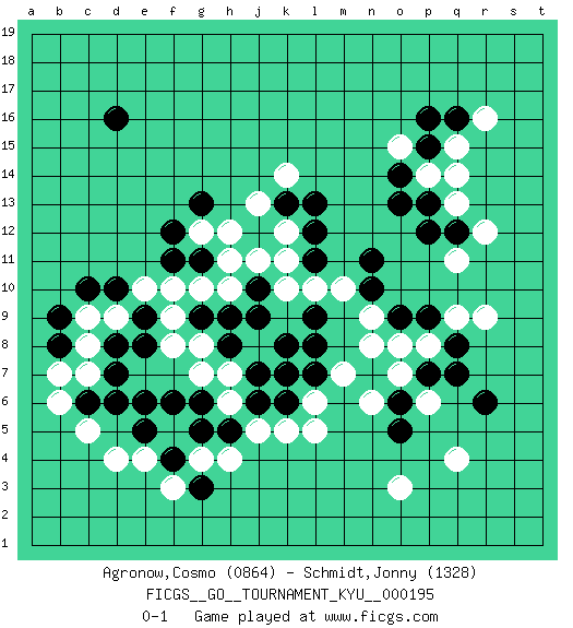 Last move : 0-1 2019 September 24 2:9:19 [Event "FICGS__GO__TOURNAMENT_KYU__000195"] [Site "FICGS"] [Date "2019.05.05"] [Round "1"] [Black "Agronow,Cosmo"] [White "Schmidt,Jonny"] [Result "0-1"] [Rating 1 "0864"] [Rating 2 "1328"] 1.q16 q4 2.d16 d4 3.r6 o3 4.e6 h11 5.l12 r9 6.p9 r12 7.g3 k11 8.f12 n9 9.n7 o8 10.l9 m10 11.p7 o7 12.o6 p8 13.q8 p6 14.q7 n6 15.o5 m7 16.l7 q9 17.q12 q13 18.p13 q11 19.p12 q14 20.p15 l6 21.k6 k7 22.l8 c5 23.c6 b6 24.b8 c7 25.d6 p14 26.o14 o15 27.o13 q15 28.p16 k5 29.j6 j5 30.h5 h6 31.j7 h4 32.g5 g4 33.f4 f5 34.g6 h7 35.k8 j8 36.k7 l5 37.h8 g7 38.f6 g8 39.j9 g10 40.l11 l10 41.o9 n8 42.g9 f9 43.h9 f8 44.e5 f10 45.j12 j11 46.g11 k12 47.k13 g12 48.f11 h10 49.j10 k10 50.d7 r16 51.n11 c8 52.n10 j13 53.g13 k14 54.l13 h12 55.d10 f3 56.d8 c9 57.c10 d9 58.e9 e10 59.e8 b7 60.b9 e4 0-1 Here are the names of the openings (joseki) played in the four corners : Corner q4 : q4 r6 Hoshi (Hwajeom, Seongjeom, Xingwei`) 4-4 Point. The star or hoshi (4-4) point, emphasizing influence at the potential expense of territory. Ikken Kakari (Hankan Keolch'im, Yi Gua`jiao~, 1-Space Low Approach). Black 2 is the standard approach move to the 4-4. Corner d4 : d4 e6 Hoshi (Hwajeom, Seongjeom, Xingwei`) 4-4 Point. The star or hoshi (4-4) point, emphasizing influence at the potential expense of territory. Corner d16 : d16 h11 Hoshi (Hwajeom, Seongjeom, Xingwei`) 4-4 Point. The star or hoshi (4-4) point, emphasizing influence at the potential expense of territory. Player White won this Go (weiqi, baduk) game. Follow this game move after move (download)The strong player plays straight, the weak diagonally. (Anonymous) You know what they say : You lie down with the Devil, you wake up in Hell. (Horatio Caine, C.S.I. Miami)