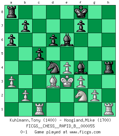 Last move : 0-1 2007 September 15 16:36:46 [Event "FICGS__CHESS__RAPID_B__000055"] [Site "FICGS"] [Date "2007.06.10"] [Round "1"] [White "Kuhlmann,Tony"] [Black "Hoogland,Mike"] [Result "0-1"] [WhiteElo "1400"] [BlackElo "1700"] 1.d4 Nf6 2.c4 e6 3.Nf3 c5 4.d5 d6 5.Nc3 exd5 6.cxd5 g6 7.Bg5 h6 8.Qa4+ Nbd7 9.Qh4 Bg7 10.Bxf6 Nxf6 11.e4 g5 12.Bb5+ Kf8 13.Nxg5 hxg5 14.Qxg5 Qe7 15.f3 a6 16.Bd3 Nxd5 17.Qxe7+ Nxe7 18.h4 Be6 19.Nd1 Nc6 20.Rc1 Be5 21.a3 Bg3+ 22.Ke2 Nd4+ 23.Ke3 Rxh4 24.Nf2 Bf4+ 0-1 Queen's pawn game Player Black won this chess game. Follow this game move after move (download)Bobby is the most misunderstood, misquoted celebrity walking the face of this earth. (Yasser Seirawan) Ich weiss nicht was Gott gegen mich auf 1.e4 antworten würde. (Robert James Fischer) El Ajedrez es despiadado: debes de estar preparado para matar gente. (Nigel Short) Les réformistes prétendent que les progrès de la théorie conduiront à la disparition des échecs, et qu'il faut, pour leur rendre vie, en remanier les règles. En réalité, qu'exprime cette affirmation? Le mépris de l'intuition, de l'imagination et de tous les autres éléments qui font des échecs un art. (Alexander Alekhine) I find television to be very educating. Every time somebody turns on the set, I go in the other room and read a book. (Groucho Marx)