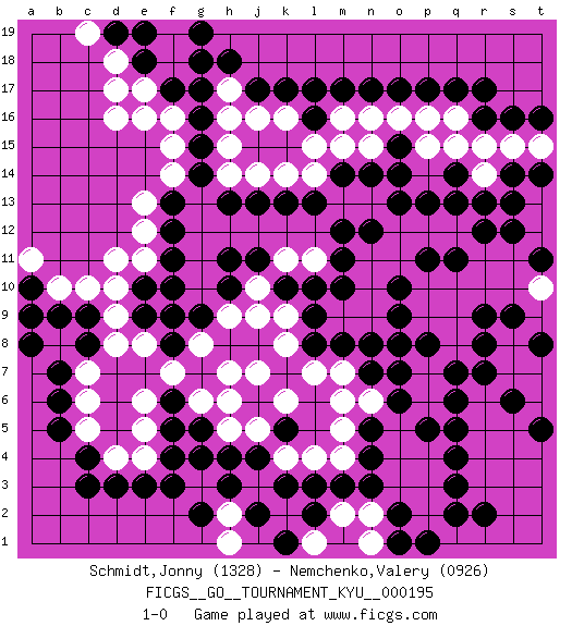 Last move : 1-0 2019 November 11 15:18:12 [Event "FICGS__GO__TOURNAMENT_KYU__000195"] [Site "FICGS"] [Date "2019.05.05"] [Round "1"] [Black "Schmidt,Jonny"] [White "Nemchenko,Valery"] [Result "1-0"] [Rating 1 "1328"] [Rating 2 "0926"] 1.q4 d16 2.r16 d4 3.f17 d17 4.k17 f16 5.g16 e16 6.g15 f15 7.g14 f14 8.r9 p9 9.r12 q10 10.l9 q9 11.r8 q8 12.q7 p7 13.q6 p6 14.p5 o5 15.o6 p4 16.q5 n6 17.o7 o8 18.n7 m7 19.n8 n9 20.m8 m9 21.l8 l7 22.m10 n10 23.m11 n11 24.n12 o12 25.o13 p12 26.p13 q12 27.q13 r11 28.r13 n13 29.m12 m13 30.n5 m6 31.o10 r10 32.o9 o11 33.p8 p10 34.s12 s11 35.s9 s10 36.o8 m5 37.n4 o4 38.n3 o3 39.k3 m4 40.m3 l4 41.l3 k4 42.j4 j5 43.h4 h5 44.g5 g6 45.g4 h7 46.f13 e13 47.f12 e12 48.f11 e11 49.m17 e17 50.g17 f18 51.k5 k6 52.j6 h6 53.f6 j7 54.c3 f7 55.e3 e6 56.g18 e19 57.r17 q16 58.r7 k8 59.l13 l14 60.k13 k14 61.j13 j14 62.m14 k9 63.d3 e4 64.c4 c5 65.b5 c6 66.b7 c7 67.b6 b8 68.c8 d8 69.c9 d9 70.k10 j10 71.j11 k11 72.l10 l11 73.r2 t9 74.b9 c10 75.q17 t12 76.q11 s8 77.p11 s13 78.o2 p2 79.q3 p3 80.h10 j9 81.p1 n2 82.o1 n1 83.q2 s7 84.s6 t6 85.t5 t7 86.t8 t10 87.t11 t13 88.s14 m15 89.n14 n15 90.o15 n16 91.n17 m16 92.l16 l15 93.a8 b10 94.a10 a11 95.a9 d11 96.e10 d10 97.e9 e8 98.f10 f9 99.g9 g8 100.f8 h9 101.h11 t10 102.t14 o16 103.o17 p16 104.p17 p15 105.o14 r15 106.f4 e5 107.f5 j3 108.f3 k16 109.l17 j16 110.f9 h15 111.q14 q15 112.j17 h16 113.g19 f19 114.d19 d18 115.e18 c19 116.e19 h14 117.h13 h17 118.h18 s15 119.s16 t15 120.t16 r14 121.s13 m2 122.l2 k2 123.j2 h2 124.h3 l1 125.k1 h1 126.g2 1-0 Here are the names of the openings (joseki) played in the four corners : Corner d16 : d16 f17 Hoshi (Hwajeom, Seongjeom, Xingwei`) 4-4 Point. The star or hoshi (4-4) point, emphasizing influence at the potential expense of territory. Ikken Kakari (Hankan Keolch'im, Yi Gua`jiao~, 1-Space Low Approach). Black 2 is the standard approach move to the 4-4. Corner d4 : d4 j4 Hoshi (Hwajeom, Seongjeom, Xingwei`) 4-4 Point. The star or hoshi (4-4) point, emphasizing influence at the potential expense of territory. Player Black won this Go (weiqi, baduk) game. Follow this game move after move (download)Be a little patient. Keshi works ! (Anonymous) All the troubles of the world come from being unable to sit alone in a quiet room. (Blaise Pascal)