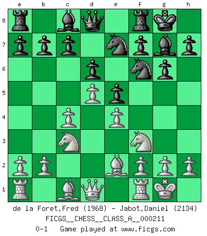 Last move : 0-1 2019 June 25 12:0:43 [Event "FICGS__CHESS__CLASS_A__000211"] [Site "FICGS"] [Date "2019.05.09"] [Round "1"] [White "de la Foret,Fred"] [Black "Jabot,Daniel"] [Result "0-1"] [WhiteElo "1968"] [BlackElo "2134"] 1.d4 Nf6 2.c4 g6 3.Nc3 Bg7 4.e4 d6 5.Nf3 O-O 6.Be2 e5 7.O-O Nc6 8.d5 Ne7 0-1 This chess game has been lost on time (started : 2019.05.09 11:29:15) King's Indian : Orthodox, Aronin-Taimanov variation (Yugoslav attack / Mar del Plata variation) Kingside Castling by player Black (move 5) Kingside Castling by player White (move 7) Player Black won this chess game. Follow this game move after move (download)Chess is imagination. (David Bronstein) Sicherlich können nur Meister einen Stil haben. Daß ein nicht-Meister auch nur ein einziges Mal in seinem Leben eine Partie folgerecht durchführte, habe ich niemals bemerkt. (Emanuel Lasker) Los problemas de Ajedrez exigen del compositor las mismas virtudes que caracterizan todo el arte de valor: originalidad, invención, concisión, armonía, complejidad e insinceridad explendida. (Vladimir Nabokov) Une platitude souvent récitée à propos des Echecs est qu'une des choses les plus difficiles à réaliser est de gagner une position gagnante. Cela ne manque pas de sens mais, pour ma part, j'ai toujours trouvé plus difficile de gagner une position perdante. (Tim Krabbe) The only thing that overcomes hard luck is hard work. (Harry Golden)