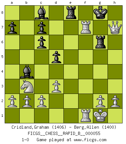 Last move : 1-0 2007 June 14 22:25:11 [Event "FICGS__CHESS__RAPID_B__000055"] [Site "FICGS"] [Date "2007.06.10"] [Round "1"] [White "Cridland,Graham"] [Black "Berg,Allen"] [Result "1-0"] [WhiteElo "1406"] [BlackElo "1400"] 1.e4 e5 2.Nf3 Nc6 3.Bb5 Nf6 4.d3 Bc5 5.O-O O-O 6.Bxc6 bxc6 7.Nxe5 Ba6 8.Bg5 Qe7 9.Ng4 Qd6 10.Bxf6 gxf6 11.Nd2 Rab8 12.Nb3 Bb4 13.Qf3 Rb5 14.Nh6+ Kh8 15.Nf5 Qe5 16.Qh3 Rg8 17.Nh6 Rg6 18.Nxf7+ Kg8 19.Nxe5 Rxe5 20.f4 Re7 21.Rf3 d5 22.e5 fxe5 23.fxe5 Rxe5 24.Raf1 Re8 25.Rf7 Bc8 26.Qxh7+ 1-0 Ruy Lopez : Berlin defense Kingside Castling by player White (move 5) Kingside Castling by player Black (move 5) Player White won this chess game. Follow this game move after move (download)Everything is in a state of flux, and this includes the world of Chess. (Mikhail Botvinnik) Es ist peinlich, dass ich nie Weltmeister wurde. Es wäre leicht, Leonid Breschnjew als Ursache vorzuschieben, dessen Apparat den Vorzeigekommunisten Anatoli Karpow in allem unterstützte. Aber Garri Kasparow zum Beispiel, der ebenfalls von den Sowjets unerwünscht war, hat trotz der Widerstände den WM-Titel erobert. (Viktor Kortschnoi) Si no le temes a Spassky, entonces elimino el elemento del dinero. (Jim Slater) Le profane ne songe pas à la somme de jouissance dont il se prive, qui méconnaît ce jeu aux ressources aussi variées que passionnantes. (Jean-Marie Jeanton-Lamarche) A belief is an idea the mind possesses, an idea that possesses the mind. (Robert Oxden Bolton)