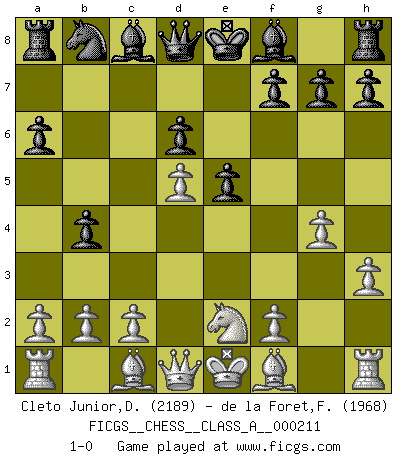 Last move : 1-0 2019 June 21 11:55:53 [Event "FICGS__CHESS__CLASS_A__000211"] [Site "FICGS"] [Date "2019.05.09"] [Round "1"] [White "Cleto Junior,Dirceu"] [Black "de la Foret,Fred"] [Result "1-0"] [WhiteElo "2189"] [BlackElo "1968"] 1.e4 c5 2.Nf3 d6 3.d4 cxd4 4.Nxd4 Nf6 5.Nc3 a6 6.h3 e5 7.Nde2 b5 8.g4 b4 9.Nd5 Nxd5 10.exd5 1-0 This chess game has been lost on time (started : 2019.05.09 11:29:15) Sicilian : Najdorf, Adams attack Player White won this chess game. Follow this game move after move (download)Alekhine is a poet who creates a work of art out of something that would hardly inspire another man to send home a picture post card. (Max Euwe) Rauchen ist dem Schachspieler bei seiner Arbeit, also im Wettkampf, untersagt. (Viktor Kortschnoi) El Ajedrez es imaginación. (David Bronstein) Dieu déplace le joueur, et celui-ci la pièce. Quel Dieu derrière Dieu commence donc la trame ? Arturo Perez-Reverte (prix de littérature policière 1993). I don't know, I don't care, and it doesn't make any difference. (Albert Einstein)
