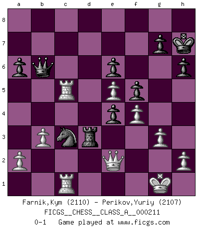 Last move : 0-1 2019 May 24 4:22:46 [Event "FICGS__CHESS__CLASS_A__000211"] [Site "FICGS"] [Date "2019.05.09"] [Round "1"] [White "Farnik,Kym"] [Black "Perikov,Yuriy"] [Result "0-1"] [WhiteElo "2110"] [BlackElo "2107"] 1.Nf3 Nf6 2.d4 d5 3.Bf4 c5 4.e3 Nc6 5.Be2 cxd4 6.exd4 Bf5 7.O-O e6 8.Nbd2 h6 9.Re1 Be7 10.c3 Nh5 11.Be3 Nf6 12.Ne5 Bd6 13.f4 O-O 14.Bf3 Qb6 15.Qb3 Qc7 16.Qb5 a6 17.Qe2 Ne4 18.Rac1 Bh7 19.Bxe4 Bxe4 20.Nxe4 dxe4 21.g3 f5 22.Rcd1 Ne7 23.Rc1 Bxe5 24.dxe5 Rfd8 25.c4 Rd3 26.b3 b5 27.cxb5 Qb7 28.b6 Nd5 29.Qf2 Kh7 30.Bc5 Rc8 31.Qe2 Rxc5 32.Rxc5 Qxb6 33.Rec1 Nc3 0-1 Reti Opening Kingside Castling by player White (move 7) Kingside Castling by player Black (move 13) Player Black won this chess game. Follow this game move after move (download)A sacrifice is best refuted by accepting it. (Wilhelm Steinitz) Der Umstand, daß uns eine 7 Stunden Zeitkontrolle ermöglicht eine großartige, tiefe Partie zu spielen, ist für die Massenmedien nicht weiter von Bedeutung. (Alexej Shirov) Tu eres para mi la Reina en d8 y yo soy el Peón en d7!!. (GM Eduard Gufeld) D'abord les bases : Jouez et étudiez, puis étudiez et jouez, ensuite jouez et étudiez, puis étudiez et jouez. Deuxièmement : Donnez toujours le meilleur de vous-même ! (Ken Smith) Hello Thibault, if I have had a plan (and I had one, I hope), I have forgotten it during the last week... - Hello Heinz-Georg. What do you mean a plan ? (Anonymous players, during a Big Chess game)