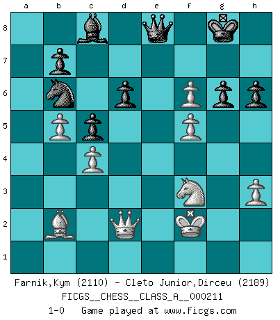 Last move : 1-0 2019 June 5 14:44:13 [Event "FICGS__CHESS__CLASS_A__000211"] [Site "FICGS"] [Date "2019.05.09"] [Round "1"] [White "Farnik,Kym"] [Black "Cleto Junior,Dirceu"] [Result "1-0"] [WhiteElo "2110"] [BlackElo "2189"] 1.d4 Nf6 2.c4 c5 3.d5 e6 4.Nc3 exd5 5.cxd5 d6 6.e4 g6 7.f4 Bg7 8.Bb5+ Nfd7 9.a4 Qe7 10.Nf3 Bxc3+ 11.bxc3 Qxe4+ 12.Kf2 O-O 13.Re1 Qf5 14.h3 Nf6 15.Qb3 Qxd5 16.c4 Ne4+ 17.Kg1 Qf5 18.g4 Qf6 19.Rb1 a6 20.Rxe4 axb5 21.axb5 Ra1 22.Rxa1 Qxa1 23.Re1 Qf6 24.Kf2 Qd8 25.Bb2 Nd7 26.g5 Re8 27.Qc3 f6 28.Rxe8+ Qxe8 29.gxf6 h6 30.Qd2 Nb6 31.f5 1-0 Benoni : pawn storm variation Kingside Castling by player Black (move 12) Player White won this chess game. Follow this game move after move (download)A big shock; the best chess player in history has passed away. (Lajos Portisch, about Bobby Fischer's death) Mein Gehirn das ist mein zweitwichtigstes Organ [Aus dem Film: Der Schläfer]. (Woody Allen) El tablero es el mundo, las piezas es el fenomeno del universo, las reglas del juego son lo que llamamos leyes de la naturaleza y el jugador del lado opuesto, se encuentra oculto a nuestra vista. (Thomas Huxley) Les échecs, c'est la lutte contre l'erreur. (Johannes Zukertort) Life is like a ten-speed bicycle: most of us have gears we never use. (Charles M. Schulz)