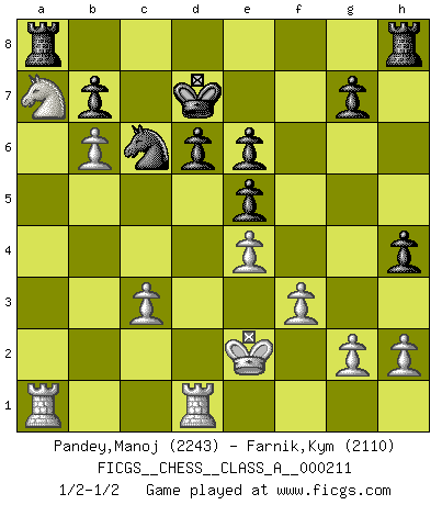 Last move : 1/2-1/2 2019 July 1 14:5:24 [Event "FICGS__CHESS__CLASS_A__000211"] [Site "FICGS"] [Date "2019.05.09"] [Round "1"] [White "Pandey,Manoj"] [Black "Farnik,Kym"] [Result "1/2-1/2"] [WhiteElo "2243"] [BlackElo "2110"] 1.e4 c5 2.Nf3 Nc6 3.d4 cxd4 4.Nxd4 e5 5.Nb5 Nf6 6.Bg5 Bc5 7.N1c3 d6 8.Bxf6 Qxf6 9.Nc7+ Kd8 10.f3 Rb8 11.Qd2 h6 12.N3d5 Qg5 13.c3 a6 14.a4 Qxd2+ 15.Kxd2 Bd7 16.a5 Bf2 17.b4 Rc8 18.b5 axb5 19.Nxb5 Bc5 20.Bd3 h5 21.Nb6 Rb8 22.Rhb1 Be6 23.Bc4 h4 24.Ke2 Bxb6 25.Bxe6 fxe6 26.axb6 Ke7 27.Na7 Kd7 28.Rd1 Ra8 1/2-1/2 Sicilian : Labourdonnais-Loewenthal variation This chess game ended in a draw. Follow this game move after move (download)By this measure (on the gap between Fischer & his contemporaries), I consider him the greatest world champion. (Garry Kasparov) Das Schachspiel ist ein See, in welchem eine Mücke baden und ein Elefant ertrinken kann. (Emanuel Lasker) El jugador blanco perdió porque fallo en recordar la coreccta continuación y tuvo que pensar por sí mismo las movidas. (Siegbert Tarrasch) Les échecs sont un jeu par leur forme, un art par leur essence et une science par sa difficulté d'acquisition. Ils peuvent vous procurer autant de plaisir qu'un bon livre ou une belle musique, mais vous n'aurez une réelle joie que si vous arrivez à bien jouer. (Tigran Petrosian) Wikichess, chess moves explained by 'experimented' players. (Thibault de Vassal)