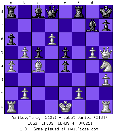 Last move : 1-0 2019 June 23 12:12:3 [Event "FICGS__CHESS__CLASS_A__000211"] [Site "FICGS"] [Date "2019.05.09"] [Round "1"] [White "Perikov,Yuriy"] [Black "Jabot,Daniel"] [Result "1-0"] [WhiteElo "2107"] [BlackElo "2134"] 1.d4 Nf6 2.c4 g6 3.Nc3 Bg7 4.e4 d6 5.h3 O-O 6.Nf3 e5 7.d5 Nh5 8.g3 c5 9.Be2 f5 10.exf5 gxf5 11.Nh4 Nf6 12.g4 Ne4 13.Nxe4 fxe4 14.g5 b5 15.cxb5 Nd7 16.a4 a6 17.Be3 c4 18.Bxc4 Nc5 19.Bxc5 dxc5 20.d6 Kh8 21.Qh5 1-0 King's Indian : Makagonov system (5.h3) Kingside Castling by player Black (move 5) Player White won this chess game. Follow this game move after move (download)The winner of the game is the player who makes the next-to-last mistake. (Savielly Tartakover) Ich las kürzlich ein Buch von Nietzsche. Er sagte Religion verdumme nur die Menschen. Ich stimme zu. (Robert James Fischer) Un mal plan es mejor que no tener ningún plan. (Frank Marshall) On n'a jamais que l'âge auquel on a commence à jouer aux échecs car après on cesse de vieillir. (Capablanca) A journey of a thousand sites begins with a single click. (Author unknown)