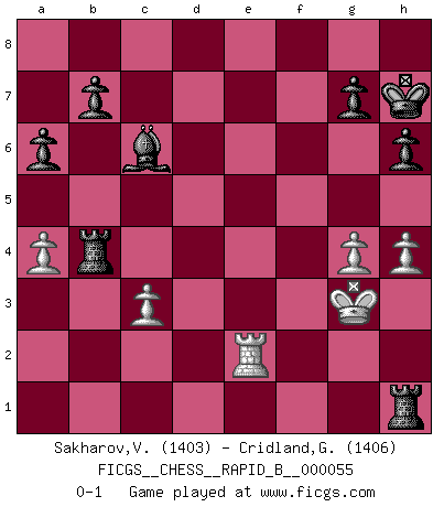 Last move : 0-1 2007 July 1 11:24:45 [Event "FICGS__CHESS__RAPID_B__000055"] [Site "FICGS"] [Date "2007.06.10"] [Round "1"] [White "Sakharov,Vitalij"] [Black "Cridland,Graham"] [Result "0-1"] [WhiteElo "1403"] [BlackElo "1406"] 1.e4 c5 2.Nf3 e6 3.Be2 Nc6 4.O-O Nf6 5.d3 d5 6.exd5 exd5 7.Re1 Be7 8.c3 O-O 9.d4 Bf5 10.Bg5 h6 11.Bh4 c4 12.Na3 Re8 13.h3 Qb6 14.Ne5 Qxb2 15.Naxc4 dxc4 16.Bxc4 Nxe5 17.dxe5 Ne4 18.Bxf7+ Kxf7 19.Bxe7 Qxf2+ 20.Kh2 Qg3+ 21.Kg1 Kxe7 22.Rxe4 Bxe4 23.Qd6+ Kf7 24.e6+ Rxe6 25.Qxg3 Rae8 26.Rf1+ Kg8 27.Qf2 a6 28.a4 Kh8 29.g4 Bc6 30.Qc5 Kh7 31.h4 Re5 32.Qd6 Re2 33.Rf7 Ra2 34.Re7 Rf8 35.Re2 Ra1+ 36.Kh2 Rh1+ 37.Kg3 Rf3+ 38.Kg2 R1h3 39.Qb4 Rd3 40.Kf2 Rh2+ 41.Ke1 Rh1+ 42.Kf2 Rf3+ 43.Kg2 Rf4 44.Kg3 Rxb4 0-1 Sicilian defense Kingside Castling by player White (move 4) Kingside Castling by player Black (move 8) Player Black won this chess game. Follow this game move after move (download)Your body has to be in top condition. Your Chess deteriorates as your body does. You can't separate body from mind. (Bobby Fischer) Das Schachspiel übertrifft alle anderen Spiele so weit wie der Chimborasso einen Misthaufen. (Arthur Schopenhauer) No es suficiente ser un buen jugador, se debe también de jugar bién. (Siegbert Tarrasch) Lorsque vous vous retrouvez devant une position atroce, ne tendez pas un ultime piège dérisoire avec l'intention d'abandonner si l'adversaire le déjoue ! Faites-vous plutôt un devoir de résister comme si votre vie en dépendait. Jouez le coup qui vous déplairait au centuple si vous étiez dans la peau de votre tortionnaire ! It is a good thing for an uneducated man to read books of quotations. (Winston Churchill)