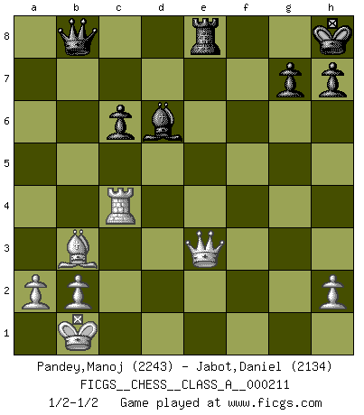 Last move : 1/2-1/2 2020 January 19 20:34:6 [Event "FICGS__CHESS__CLASS_A__000211"] [Site "FICGS"] [Date "2019.05.09"] [Round "1"] [White "Pandey,Manoj"] [Black "Jabot,Daniel"] [Result "1/2-1/2"] [WhiteElo "2243"] [BlackElo "2134"] 1.e4 c5 2.Nf3 d6 3.d4 cxd4 4.Nxd4 Nf6 5.Nc3 Nc6 6.Bc4 e6 7.Be3 Be7 8.Qe2 a6 9.O-O-O O-O 10.f4 Qc7 11.Nxc6 bxc6 12.g4 Bb7 13.g5 Nd7 14.Bb3 a5 15.f5 exf5 16.Rhg1 a4 17.Nxa4 fxe4 18.Bf4 Kh8 19.Qxe4 Ne5 20.Qe3 Ng6 21.Nc5 Rae8 22.Qd2 Qc8 23.Nxb7 Nxf4 24.Qxf4 Qxb7 25.Kb1 d5 26.c4 Qb4 27.Rgf1 f5 28.gxf6 Rxf6 29.Qe3 Rxf1 30.Rxf1 dxc4 31.Rf4 Qb8 32.Rxc4 Bd6 1/2-1/2 Sicilian : Sozin, not Scheveningen Queenside Castling by player White (move 9) Kingside Castling by player Black (move 9) This chess game ended in a draw. Follow this game move after move (download)Chess is war over the board. The object is to crush the opponents mind. (Bobby Fischer) Der vorletzte Fehler gewinnt. (Savielly Grigorievitsch Tartakower) Haz el enroque temprano y seguido. (Rob Sillars) A ce moment-là, je menaçais de comprendre la position ! (Clément L'Heureux) It's not the size of the dog in the fight, it's the size of the fight in the dog. (Mark Twain)