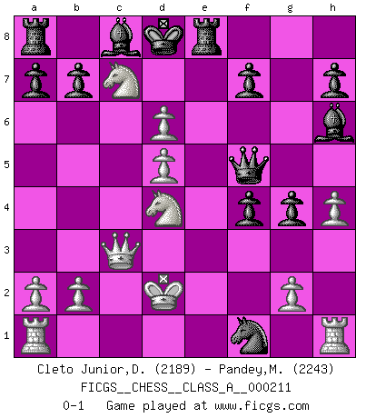 Last move : 0-1 2019 June 5 16:57:27 [Event "FICGS__CHESS__CLASS_A__000211"] [Site "FICGS"] [Date "2019.05.09"] [Round "1"] [White "Cleto Junior,Dirceu"] [Black "Pandey,Manoj"] [Result "0-1"] [WhiteElo "2189"] [BlackElo "2243"] 1.e4 e5 2.f4 exf4 3.Nf3 d6 4.d4 g5 5.h4 g4 6.Ng1 Qf6 7.Nc3 Ne7 8.Nge2 Bh6 9.Qd2 Nbc6 10.Nb5 Kd8 11.e5 Qf5 12.exd6 Nd5 13.Nxc7 Ne3 14.Qc3 Nb4 15.Bxe3 Nxc2+ 16.Kd2 Nxe3 17.d5 Re8 18.Nd4 Nxf1+ 0-1 KGA : Fischer defense Player Black won this chess game. Follow this game move after move (download)I have added these principles to the law: get the Knights into action before both Bishops are developed. (Emanuel Lasker) Computer sind die einzigen Gegner, die nicht immer eine Ausrede auf Lager haben, wenn sie gegen mich verlieren. (Robert James Fischer) La última cosa en que Fischer estaba interesado era en tonterías, siempre y cuando el Ajedrez estuviera involucrado. (Elie Agur) Même si vous avez un bon coup à faire, regardez toujours s'il n'y en a pas un qui lui soit préférable. (Pedro Damiano) Somehow our devils are never quite what we expect when we meet them face to face. (Nelson DeMille)