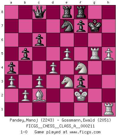 Last move : 1-0 2019 June 27 3:4:4 [Event "FICGS__CHESS__CLASS_A__000211"] [Site "FICGS"] [Date "2019.05.09"] [Round "1"] [White "Pandey,Manoj"] [Black "Gossmann,Ewald"] [Result "1-0"] [WhiteElo "2243"] [BlackElo "2051"] 1.e4 e5 2.Nf3 Nf6 3.Nc3 Nc6 4.Bb5 Nd4 5.Bc4 Bc5 6.Nxe5 Qe7 7.Nf3 d5 8.Bxd5 Bg4 9.d3 c6 10.Bb3 Nd7 11.Be3 Ne5 12.Nxd4 Bxd1 13.Nf5 Qf8 14.Rxd1 Bxe3 15.Nxe3 h5 16.f3 Ng6 17.Ne2 a5 18.c3 a4 19.Bc2 Qd6 20.d4 O-O 21.Kf2 Ne7 22.a3 Qc7 23.g3 g6 24.h4 Kh8 25.Nf4 Qb6 26.Rb1 Qc7 27.Rbd1 b5 28.Nd3 Rae8 29.e5 Qc8 30.g4 hxg4 31.Rdg1 gxf3 32.Nf4 Kg7 33.h5 g5 34.Rxg5+ 1-0 Petrov Three knights game Kingside Castling by player Black (move 20) Player White won this chess game. Follow this game move after move (download)Chess is a beautiful mistress. (Bent Larsen) Woher wissen wir, daß der Neanderthaler Blindschach gespielt hat? -- Bei Ausgrabungen wurden keine Schachbretter und Figuren gefunden. (Anonymous) Nunca nadie ha ganado una partida de Ajedrez rindiendose. (Unknown) Les ravages du H expliquent la différence de niveau entre Tal et Thal [Abergel]. Art is the triumph over chaos. (John Cheever)
