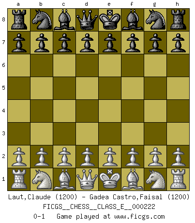 Last move : 0-1 2019 June 19 2:20:57 [Event "FICGS__CHESS__CLASS_E__000222"] [Site "FICGS"] [Date "2019.05.09"] [Round "1"] [White "Laut,Claude"] [Black "Gadea Castro,Faisal"] [Result "0-1"] [WhiteElo "1200"] [BlackElo "1200"] 0-1 This chess game has been lost on time (started : 2019.05.09 19:22:20) Player Black won this chess game. Follow this game move after move (download)Suddenly it was obvious to me in my analysis I had missed what Fischer had found with the greatest of ease at the board. (Mikhail Botvinnik) Kombinieren und Schwarzhandel gehören verboten. (Savielly Grigorievitsch Tartakower) ¡Examina movidas que hagan daño! Un buen ojo for movidas desvastantes es mucho mas importante que el conocimiento de principios estratégicos. (Purdy) Dieu déplace le joueur, et celui-ci la pièce. Quel Dieu derrière Dieu commence donc la trame ? Arturo Perez-Reverte (prix de littérature policière 1993). Locking firmely the window serves nothing, only small thiefs pass through there, the big thiefs enter through the front door. (Luc-Olivier Leclerc)