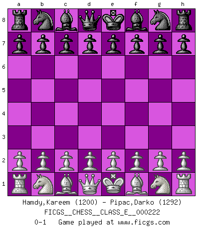 Last move : 0-1 2019 June 19 2:20:57 [Event "FICGS__CHESS__CLASS_E__000222"] [Site "FICGS"] [Date "2019.05.09"] [Round "1"] [White "Hamdy,Kareem"] [Black "Pipac,Darko"] [Result "0-1"] [WhiteElo "1200"] [BlackElo "1292"] 0-1 This chess game has been lost on time (started : 2019.05.09 19:22:20) Player Black won this chess game. Follow this game move after move (download)In Chess, as it is played by masters, chance is practically eliminated. (Emanuel Lasker) Ich bin der einzige Schachspieler, der sich während der Vorbereitungen zum Turnier verletzt hat. (Woody Allen) Haz el enroque temprano y seguido. (Rob Sillars) Votre prénom est 'Tactique', votre deuxième prénom est 'Tactique' et votre nom est 'Tactique'. (Ken Smith) Perseverance does not equal worthiness. Next time you want to get my attention, wear something fun. Low-riding jeans are hot. (Gregory House, House M.D.)