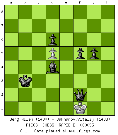 Last move : 0-1 2007 July 11 17:57:8 [Event "FICGS__CHESS__RAPID_B__000055"] [Site "FICGS"] [Date "2007.06.10"] [Round "1"] [White "Berg,Allen"] [Black "Sakharov,Vitalij"] [Result "0-1"] [WhiteElo "1400"] [BlackElo "1403"] 1.e4 c6 2.d3 d6 3.c4 Nf6 4.Nf3 Bg4 5.Nc3 Nbd7 6.h3 Bh5 7.Be2 Qc7 8.Nd4 Bxe2 9.Qxe2 e5 10.Nb3 O-O-O 11.Be3 h6 12.O-O-O c5 13.Bd2 Nb8 14.g4 Nc6 15.f3 Nd4 16.Nxd4 cxd4 17.Na4 b5 18.Nc3 dxc3 19.Bxc3 bxc4 20.dxc4 Nd7 21.Rd5 Nb6 22.Ba5 f6 23.Rhd1 Qc6 24.Qc2 Rd7 25.R1d3 Nxd5 26.cxd5 Qxc2+ 27.Kxc2 Be7 28.Rb3 Rb7 29.a4 Rxb3 30.Kxb3 h5 31.Kc4 hxg4 32.fxg4 Rxh3 33.b4 Kb7 34.b5 Re3 35.Bd2 Rxe4+ 36.Kb3 Rxg4 37.a5 Rd4 38.a6+ Kb6 39.Be3 Kxb5 40.Bxd4 exd4 41.Kc2 Kxa6 42.Kd3 f5 43.Kxd4 Kb5 44.Ke3 g5 45.Kf3 a5 46.Ke3 Bf6 47.Kd3 a4 48.Kc2 Kc4 49.Kb1 Kb3 50.Kc1 a3 51.Kd2 a2 52.Kd3 a1Q 53.Ke2 Qc3 54.Kd1 Qc2+ 55.Ke1 Bd4 56.Kf1 Qf2+ 0-1 Comment by player 1 : Allen Berg : Good job Caro-Kann : Closed (Breyer) variation Queenside Castling by player Black (move 10) Queenside Castling by player White (move 12) 10 pieces endgame at move 40 : White KPP , Black KBPPPPP WHITE : King + 2 Pawns BLACK : King + 1 Bishop 5 Pawns 9 pieces endgame at move 41 : White KP , Black KBPPPPP WHITE : King + 1 Pawn BLACK : King + 1 Bishop 5 Pawns 8 pieces endgame at move 43 : White KP , Black KBPPPP WHITE : King + 1 Pawn BLACK : King + 1 Bishop 4 Pawns Promotion Queen by player Black (move 52) Player Black won this chess game. Follow this game move after move (download)Tactics flow from a superior position. (Bobby Fischer) Ich kenne keine einzige Person, die behaupten würde, Garri Kasparow sei ein guter Mensch (Nigel Short) Hay jugadores fuertes y personas amables y yo soy un jugador fuerte. (Bobby Fischer) Le temps de noter son nom sur la feuille de partie, j'étais déjà en zeitnot ! D'un modeste amateur apparié lors de la première ronde d'un open contre le grand-maître Azmaïparashvili. In God we trust, all others we virus scan. (Anonymous)