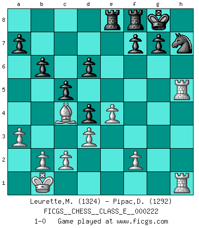 Last move : 1-0 2019 May 22 4:39:4 [Event "FICGS__CHESS__CLASS_E__000222"] [Site "FICGS"] [Date "2019.05.09"] [Round "1"] [White "Leurette,Marc-Antoine"] [Black "Pipac,Darko"] [Result "1-0"] [WhiteElo "1324"] [BlackElo "1292"] 1.e4 e5 2.Nf3 Nc6 3.Bc4 h6 4.Nc3 Nf6 5.d3 Bb4 6.Bd2 d6 7.a3 Bxc3 8.Bxc3 Bg4 9.h3 Bxf3 10.Qxf3 O-O 11.O-O-O Nd4 12.Bxd4 exd4 13.g4 c5 14.h4 b6 15.g5 hxg5 16.hxg5 Nh7 17.Qh5 Qxg5+ 18.Kb1 Qxh5 19.Rxh5 Rae8 20.Rdh1 1-0 King's pawn game Kingside Castling by player Black (move 10) Queenside Castling by player White (move 11) Player White won this chess game. Follow this game move after move (download)The combination player thinks forward; he starts from the given position, and tries the forceful moves in his mind. (Emanuel Lasker) Konzentriere dich auf materielle Gewinne. Nimm, was dir dein Gegner gibt, ausser es gibt einen guten Grund der dagegenspricht. (Robert James Fischer) Yo adoro todas la posiciones. Denme una partida posicional difícil, y la jugaré. Pero posiciones totalmente ganadas, no las tolero. (Hein Donner) Pour se monter efficace, un Cavalier a besoin d'avant-postes ! Les Cavaliers font les meilleurs bloqueurs de pions passés. Industry executives and analysts often mistakenly talk about strategy as if it were some kind of chess match. But in chess, you have just two opponents, each with identical resources, and with luck playing a minimal role. The real world is much more like a poker game, with multiple players trying to make the best of whatever hand fortune has dealt them. In our industry, Bill Gates owns the table until someone proves otherwise. (David Moschella, 'Computerworld')