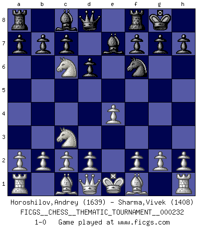 Last move : 1-0 2019 July 8 11:45:41 [Event "FICGS__CHESS__THEMATIC_TOURNAMENT__000232"] [Site "FICGS"] [Date "2019.05.09"] [Round "1"] [White "Horoshilov,Andrey"] [Black "Sharma,Vivek"] [Result "1-0"] [WhiteElo "1639"] [BlackElo "1408"] 1.e4 e5 2.Nf3 Nf6 3.Nxe5 d6 4.Nd3 Be7 5.Nc3 O-O 6.Nb4 Nc6 7.Nxc6 1-0 This chess game has been lost on time (started : 2019.05.09 19:23:14) Petrov's defense Kingside Castling by player Black (move 5) Player White won this chess game. Follow this game move after move (download)What is the object of playing a gambit opening?... To acquire a reputation of being a dashing player at the cost of losing a game. (Siegbert Tarrasch) Glücklicherweise sind Großmeister Ruben Fines reine Schachbücher weniger phallozentrisch [als seine Schachpsychologie] und deswegen auch weniger lächerlich. (Nigel Short) Un buen sacrificio es aquel que aunque no sea necesariamente sólido, deja a tu oponente aturdido y confuso. (Rudolph Spielmann) La tactique est l'élément le plus important du milieu de jeu. (Siegbert Tarrasch) Man is reluctant to give credit for intelligence to anyone, except his enemies. (Albert Einstein)