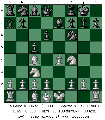Last move : 1-0 2019 June 19 15:17:6 [Event "FICGS__CHESS__THEMATIC_TOURNAMENT__000232"] [Site "FICGS"] [Date "2019.05.09"] [Round "1"] [White "Zaunercik,Ilmar"] [Black "Sharma,Vivek"] [Result "1-0"] [WhiteElo "1111"] [BlackElo "1408"] 1.e4 e5 2.Nf3 Nf6 3.Nxe5 d6 4.Nd3 Be7 5.Nc3 O-O 6.Nf4 c5 7.Bc4 1-0 This chess game has been lost on time (started : 2019.05.09 19:23:14) Petrov's defense Kingside Castling by player Black (move 5) Player White won this chess game. Follow this game move after move (download)He who fears an isolated Queen's Pawn should give up Chess. (Siegbert Tarrasch) Ein typischer, sehr verbreiteter Gedankenschädling ist der, daß der betreffende Amateur von der Annanhme ausgeht, daß jeder einzelne Zug etwas zu leisten habe. (Aaron Nimzowitsch) Cuando me preguntan: -¿Cual es el secreto que te hace hacer mejores movidas que tus oponentes?, Yo respondo: Me da gusto que me pregunten eso, porque, como veran, hay una simple razón. Yo pienso mis propias movidas y dejo a mi oponente que el piense las suyas. (Alexander Alekhine) Des idées, des idées, j'en ai cent, j'en ai mille. Des bonnes, des mauvaises, applicables, irréalisables... Il suffit de faire le tri ! (Roos) Philosophers use a language that is already deformed as though by shoes that are too tight. (Ludwig Wittgenstein)