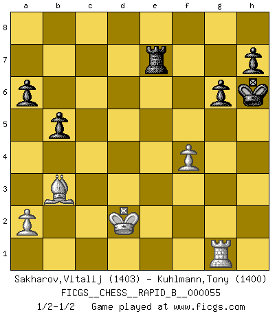 Last move : 1/2-1/2 2007 July 10 19:0:15 [Event "FICGS__CHESS__RAPID_B__000055"] [Site "FICGS"] [Date "2007.06.10"] [Round "1"] [White "Sakharov,Vitalij"] [Black "Kuhlmann,Tony"] [Result "1/2-1/2"] [WhiteElo "1403"] [BlackElo "1400"] 1.f4 d5 2.Nf3 Nc6 3.e3 g6 4.d4 Bg7 5.Bb5 Bd7 6.O-O Nf6 7.c3 O-O 8.Nbd2 a6 9.Bd3 b5 10.Ne5 Rb8 11.Nxd7 Qxd7 12.f5 e5 13.fxg6 fxg6 14.dxe5 Nxe5 15.Bc2 c5 16.Nf3 Nc6 17.Rb1 Rbe8 18.h3 Ne5 19.Qe2 Nh5 20.Bd2 Ng3 21.Qf2 Nxf3+ 22.gxf3 Qxh3 23.Qg2 Qxg2+ 24.Kxg2 Nxf1 25.Rxf1 d4 26.cxd4 cxd4 27.e4 Kh8 28.f4 d3 29.Bxd3 Bxb2 30.Kf3 Rd8 31.Ke2 Rf7 32.Bc2 Rfd7 33.Ba5 Rc8 34.Bb3 Re7 35.e5 Kg7 36.Kf3 Rd7 37.e6 Rd3+ 38.Ke2 Rh3 39.Rd1 Bc3 40.Bxc3+ R8xc3 41.Rd7+ Kh6 42.e7 Rh2+ 43.Kd1 Rg3 44.Kc1 Rg1+ 45.Rd1 Re2 46.Rxg1 Rxe7 47.Kd2 1/2-1/2 Bird's Opening Kingside Castling by player White (move 6) Kingside Castling by player Black (move 7) This chess game ended in a draw. Follow this game move after move (download)A great player and a great example for many. His book My 60 Memorable Games had a big impact on me. It is a shame he didn't continue to enrich the world of chess with his unparalleled understanding after 1972. (Jan Timman, about Bobby Fischer's death) Schach ist ein Teil der Kultur, und wenn es mit der Kultur abwärts geht, geht es auch mit dem Schach abwärts. (Mikhail Moiseyevich Botvinik) La estratégia requiere pensar, la táctica requiere observación. (Max Euwe) On entre au jeu d'Echecs comme on entre en Religion. Pour le joueur d'Echecs, la partie d'Echecs c'est l'office, la messe, le défilé du 1er Mai, le dépôt de gerbe au Monument aux Morts. C'est un drame sacré. (Michel Roos) There are lots of people who mistake their imagination for their memory. (Josh Bilings)