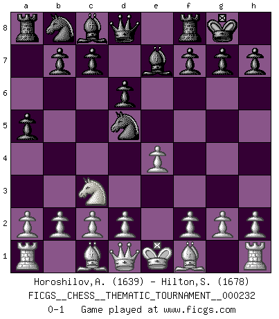 Last move : 0-1 2019 June 20 10:45:20 [Event "FICGS__CHESS__THEMATIC_TOURNAMENT__000232"] [Site "FICGS"] [Date "2019.05.09"] [Round "1"] [White "Horoshilov,Andrey"] [Black "Hilton,Stephen"] [Result "0-1"] [WhiteElo "1639"] [BlackElo "1678"] 1.e4 e5 2.Nf3 Nf6 3.Nxe5 d6 4.Nd3 Be7 5.Nc3 O-O 6.Nb4 a5 7.Nbd5 Nxd5 0-1 This chess game has been lost on time (started : 2019.05.09 19:23:14) Petrov's defense Kingside Castling by player Black (move 5) Player Black won this chess game. Follow this game move after move (download)Becoming successful at Chess allows you to discover your own personality. That's what I want for the kids I teach. (Saudin Robovic) Es hat in meinem Leben Zeiten gegeben, in denen das Schachspiel, wenn nicht zum Lebenszweck, so doch zu einem regelrechten Lebensersatz geworden ist. Man fühlt sich in solchen Zeiten nicht so, als besäße man eine göttliche Gabe, sondern eher so, als sei man von ihr besessen. (Garry Kasparov) La estratégia requiere pensar, la táctica requiere observación. (Max Euwe) Karpov est une pièce de musée. (Garry Kasparov) Luck has a peculiar habit of favoring those who don't depend on it. (Author unknown)