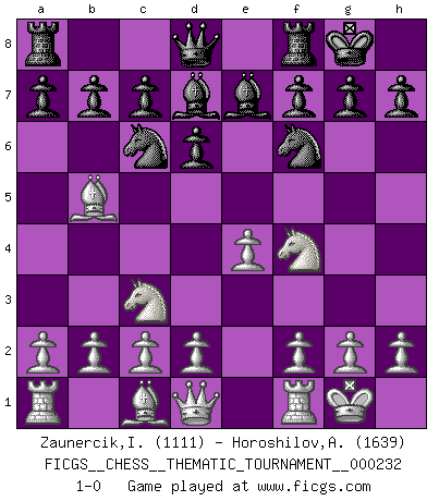 Last move : 1-0 2019 June 20 10:45:20 [Event "FICGS__CHESS__THEMATIC_TOURNAMENT__000232"] [Site "FICGS"] [Date "2019.05.09"] [Round "1"] [White "Zaunercik,Ilmar"] [Black "Horoshilov,Andrey"] [Result "1-0"] [WhiteElo "1111"] [BlackElo "1639"] 1.e4 e5 2.Nf3 Nf6 3.Nxe5 d6 4.Nd3 Nc6 5.Nf4 Be7 6.Nc3 O-O 7.Bb5 Bd7 8.O-O 1-0 This chess game has been lost on time (started : 2019.05.09 19:23:14) Petrov's defense Kingside Castling by player Black (move 6) Kingside Castling by player White (move 8) Player White won this chess game. Follow this game move after move (download)Chess is a matter of delicate judgment, knowing when to punch and how to duck. (Bobby Fischer) Ich verlor meine Bürgerrechte, mein Gehalt wurde mir nicht mehr bezahlt und ich wurde zensiert und durfte nicht mehr ins Ausland reisen. [nach dem Match Fischer-Taimanov 6:0] (Mark Taimanov) Yo considero que Fischer es uno de los expertos mas grandes de aperturas de siempre. (Keith Hayward) Avec des compensations pour le matériel en plus... (Anonyme) The best weapon against an enemy is another enemy. (Friedrich Nietzsche)