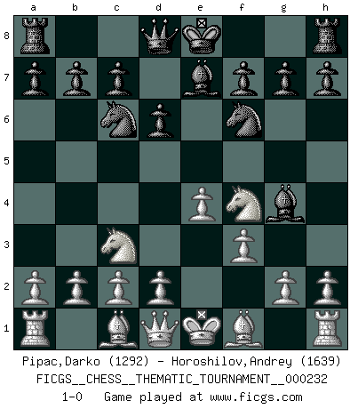Last move : 1-0 2019 June 20 10:45:20 [Event "FICGS__CHESS__THEMATIC_TOURNAMENT__000232"] [Site "FICGS"] [Date "2019.05.09"] [Round "1"] [White "Pipac,Darko"] [Black "Horoshilov,Andrey"] [Result "1-0"] [WhiteElo "1292"] [BlackElo "1639"] 1.e4 e5 2.Nf3 Nf6 3.Nxe5 d6 4.Nd3 Nc6 5.Nc3 Be7 6.Nf4 Bg4 7.f3 1-0 This chess game has been lost on time (started : 2019.05.09 19:23:14) Petrov's defense Player White won this chess game. Follow this game move after move (download)Live, lose, and learn, by observing your opponent how to win. (Amber Steenbock) Ich würde die 30 stärksten Spieler der USA im Simultanspiel besiegen. (José Raúl Capablanca) Morphy probablemente fue el genio más grande de todos. (Bobby Fischer) Le joueur d'Echecs qui veut atteindre le top est obligé de développer son propre credo créatif. Alexeï Stepanovicth Souétine. Il est facile d'écrire des livres ! Ce qui est difficile, c'est de jouer ! (Alexeï Stepanovicth Souétine) Happy endings are just stories that haven't finished yet. (Jane Smith in Mr & Mrs Smith)