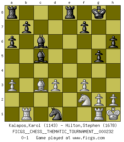 Last move : 0-1 2019 May 23 3:45:30 [Event "FICGS__CHESS__THEMATIC_TOURNAMENT__000232"] [Site "FICGS"] [Date "2019.05.09"] [Round "1"] [White "Kalapos,Karol"] [Black "Hilton,Stephen"] [Result "0-1"] [WhiteElo "1143"] [BlackElo "1678"] 1.e4 e5 2.Nf3 Nf6 3.Nxe5 d6 4.Nd3 Nxe4 5.Qe2 Qe7 6.f3 Nf6 7.Qxe7+ Bxe7 8.Be2 O-O 9.O-O Nc6 10.a3 Be6 11.Nc3 a6 12.Kh1 Nd4 13.Bd1 Bc4 14.Re1 Rfe8 15.Nb4 c5 16.Nba2 Bf8 17.Rg1 h6 18.d3 Be6 19.Be3 Nf5 20.Bd2 d5 21.Ne2 d4 22.Nf4 Bd7 23.Rb1 g5 24.Nh3 Ne3 25.Nf2 Bc6 26.b4 Nfd5 27.bxc5 Bxc5 28.c4 dxc3 29.Nxc3 Nxc3 30.Bxc3 Nxd1 0-1 Petrov's defense Kingside Castling by player Black (move 8) Kingside Castling by player White (move 9) Player Black won this chess game. Follow this game move after move (download)Though most people love to look at the games of the great attacking masters, some of the most successful players in history have been the quiet positional players. They slowly grind you down by taking away your space, tying up your pieces, and leaving you with virtually nothing to do ! (Yasser Seirawan) Spiel ein langweiliges Spiel zu Ende und lustige Dinge können passieren. (Hans Ree) Si yo gano un torneo, yo lo gano por mí mismo. Yo hago las jugadas. Nadie me ayuda. (Bobby Fischer) Même si vous avez un bon coup à faire, regardez toujours s'il n'y en a pas un qui lui soit préférable. (Pedro Damiano) A clear conscience is usually the sign of a bad memory. (Unknown)