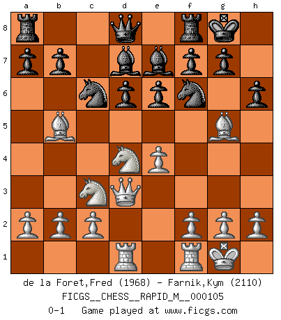 Last move : 0-1 2019 June 22 1:29:33 [Event "FICGS__CHESS__RAPID_M__000105"] [Site "FICGS"] [Date "2019.05.11"] [Round "1"] [White "de la Foret,Fred"] [Black "Farnik,Kym"] [Result "0-1"] [WhiteElo "1968"] [BlackElo "2110"] 1.e4 c5 2.Nf3 d6 3.d4 cxd4 4.Nxd4 Nf6 5.Nc3 Nc6 6.Bb5 Bd7 7.Bg5 e6 8.Qd3 Be7 9.O-O O-O 10.Rad1 h6 0-1 This chess game has been lost on time (started : 2019.05.11 10:23:29) Sicilian Kingside Castling by player White (move 9) Kingside Castling by player Black (move 9) Player Black won this chess game. Follow this game move after move (download)The enormous mental resilience, without which no Chess player can exist, was so much taken up by Chess that he could never free his mind of this game. (Albert Einstein) Das Schach ist nichts für kleine Geister, es beansprucht einen vollen Mann, der sich nicht sklavisch an das Überlieferte hält, sondern selbständig die Tiefen des Spiels zu ergründen sucht. (Wilhelm Steinitz) Cualquier cambio de material en una posición debe venir por medio de un mate, una captura o promoción de Peón. (Purdy) Les Echecs ont trois composantes : le temps, l'espace et le matériel en dernier. (Mikhail Tal) If you work for a living, why do you kill yourself working ? (Tuco to a chicken in The Good, The Bad and The Ugly)