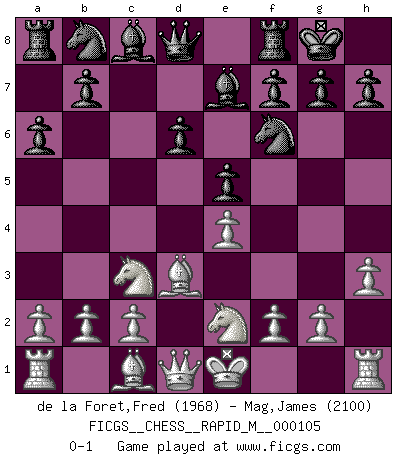 Last move : 0-1 2019 June 22 1:29:33 [Event "FICGS__CHESS__RAPID_M__000105"] [Site "FICGS"] [Date "2019.05.11"] [Round "1"] [White "de la Foret,Fred"] [Black "Mag,James"] [Result "0-1"] [WhiteElo "1968"] [BlackElo "2100"] 1.e4 c5 2.Nf3 d6 3.d4 cxd4 4.Nxd4 Nf6 5.Nc3 a6 6.Bd3 e5 7.Nde2 Be7 8.h3 O-O 0-1 This chess game has been lost on time (started : 2019.05.11 10:23:29) Sicilian : Najdorf Kingside Castling by player Black (move 8) Player Black won this chess game. Follow this game move after move (download)Kasparov : J'adoube , Ivanchuk : S'il vous plaît ! (Garry Kasparov & Vassily Ivanchuk, Linares 1997) Ich brauche nur einen Blick auf das Schachbrett zu werfen, und weiß schon, was in der Stellung steckt, was geschehen kann und was geschehen wird. Alle übrigen suchen und prüfen, ich aber weiß es! (José Raúl Capablanca) Morphy probablemente fue el genio más grande de todos. (Bobby Fischer) Botvinnik disait en comparant les échecs à la musique: Il existe une science dont le but est l'étude de l'acoustique et des sons. Mais il y a aussi un art qui se sert de l'océan des sons : c'est la musique. De toute évidence, il en est de même pour la pensée. La logique est l'étude des lois de la réflexion et les échecs reflètent, en tant qu'art, le côté logique de la réflexion, sous la forme d'images artistiques... Extrait de Fischer - Spassky, Reykjavik 1972 par Alexander & F. Wyndham (Ed. Solar), p 37. Mac users swear by their computers. PC users swear at their computers. (Author unknown)