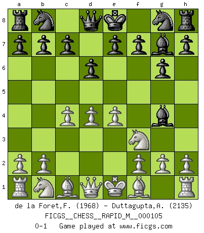 Last move : 0-1 2019 June 23 8:2:56 [Event "FICGS__CHESS__RAPID_M__000105"] [Site "FICGS"] [Date "2019.05.11"] [Round "1"] [White "de la Foret,Fred"] [Black "Duttagupta,Aniruddha"] [Result "0-1"] [WhiteElo "1968"] [BlackElo "2135"] 1.e4 d6 2.d4 g6 3.c4 Bg7 4.Nf3 Bg4 0-1 This chess game has been lost on time (started : 2019.05.11 10:23:29) King's pawn Opening Player Black won this chess game. Follow this game move after move (download)There are tough players and nice guys, and I'm a tough player. (Bobby Fischer) Habe Mut, dich deines eigenen Verstandes zu bedienen. (Immanuel Kant) Una mala movida nulifica cuarenta buenas. (Horowitz) On entre au jeu d'Echecs comme on entre en Religion. Pour le joueur d'Echecs, la partie d'Echecs c'est l'office, la messe, le défilé du 1er Mai, le dépôt de gerbe au Monument aux Morts. C'est un drame sacré. (Michel Roos) The problem with troubleshooting is that trouble shoots back. (Anonymous)