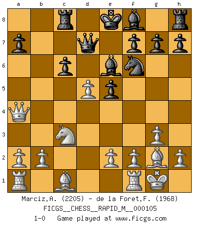 Last move : 1-0 2019 June 20 23:55:11 [Event "FICGS__CHESS__RAPID_M__000105"] [Site "FICGS"] [Date "2019.05.11"] [Round "1"] [White "Marciz,Alexander"] [Black "de la Foret,Fred"] [Result "1-0"] [WhiteElo "2205"] [BlackElo "1968"] 1.Nf3 d5 2.g3 c5 3.Bg2 Nf6 4.O-O Nc6 5.d4 cxd4 6.Nxd4 e5 7.Nxc6 bxc6 8.c4 Be6 9.Qa4 Qd7 10.Nc3 Rc8 11.cxd5 1-0 This chess game has been lost on time (started : 2019.05.11 10:23:29) Reti : King's Indian attack Kingside Castling by player White (move 4) Player White won this chess game. Follow this game move after move (download)You must take your opponent into a deep dark forest where 2+2=5, and the path leading out is only wide enough for one. (Mikhail Tal) Wenn du auf das Glück wartest, wird das Leben ziemlich langweilig. (Mikhail Nekhemyevich Tal) El Peón aislado arroja penumbra sobre todo el tablero. (Aaron Nimzovich) Je crois qu'il existe des manières très spécifiques de jouer efficacement contre une machine. Evidemment, nous n'avons aucune chance en technique pure, parce que l'ordinateur calcule de manière parfaite. Mais lorsque nous faisons appel à notre cerveau, en utilisant l'intuition et la compréhension, alors nous restons beaucoup plus forts. (Anatoli Karpov) For peace of mind, resign as general manager of the universe. (Douglas Adams)
