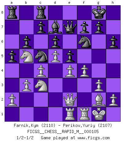 Last move : 1/2-1/2 2019 May 20 15:42:3 [Event "FICGS__CHESS__RAPID_M__000105"] [Site "FICGS"] [Date "2019.05.11"] [Round "1"] [White "Farnik,Kym"] [Black "Perikov,Yuriy"] [Result "1/2-1/2"] [WhiteElo "2110"] [BlackElo "2107"] 1.d4 e6 2.Nf3 Nf6 3.c4 Bb4+ 4.Bd2 Bxd2+ 5.Qxd2 b6 6.Nc3 Bb7 7.g3 O-O 8.Bg2 d6 9.d5 a5 10.Nd4 e5 11.Ndb5 Na6 12.e4 Bc8 13.O-O Bd7 14.Rae1 Qe7 15.b3 Rfc8 16.f4 h6 17.Qe2 Kh7 18.Qb2 Nc5 19.Qd2 Kg8 20.Qe2 1/2-1/2 Queen's pawn Kingside Castling by player Black (move 7) Kingside Castling by player White (move 13) This chess game ended in a draw. Follow this game move after move (download)Bobby Fischer is the greatest Chess genius of all time ! (Alexander Kotov) Schach ist ein schwarz-weisser Dschungel. (Garry Kasparov) Peones: ellos son el alma de esta partida, solos forman el ataque y la defensa. (Philidor) Les Echecs ne sont pas pour les âmes timides. Ils requièrent un homme entier, qui ne s'arrête pas aveuglément à ce qui a été déjà établi, mais qui tente individuellement de sonder les profondeurs du jeu. (W. Steinitz) At last I discovered the true beauty of chess. So I proposed to her. (Dinesh De Silva)