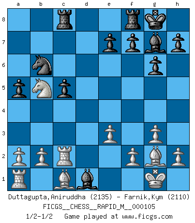 Last move : 1/2-1/2 2019 July 8 5:21:13 [Event "FICGS__CHESS__RAPID_M__000105"] [Site "FICGS"] [Date "2019.05.11"] [Round "1"] [White "Duttagupta,Aniruddha"] [Black "Farnik,Kym"] [Result "1/2-1/2"] [WhiteElo "2135"] [BlackElo "2110"] 1.d4 Nf6 2.c4 g6 3.g3 c6 4.Bg2 d5 5.Qa4 Bg7 6.cxd5 Nxd5 7.Nf3 Bg4 8.Nbd2 O-O 9.O-O Na6 10.e3 Rc8 11.Ne4 Bf5 12.Nc5 Nb6 13.Qb3 Nxc5 14.dxc5 Nd7 15.Rd1 Qc7 16.Qb4 b6 17.cxb6 Qxb6 18.Qxb6 Nxb6 19.Nd4 Bg4 20.Rd2 c5 21.Nb5 a5 22.Rc2 Bd1 23.Rd2 Bg4 24.Rc2 Bd1 1/2-1/2 King's Indian : 3.g3 Kingside Castling by player Black (move 8) Kingside Castling by player White (move 9) This chess game ended in a draw. Follow this game move after move (download)Chess makes man wiser and clear-sighted. (Vladimir Putin) Wenn ich mich einlogge, glauben die Leute gewöhnlich nicht, dass ich es selbst bin und sie fangen an, mir dumme Fragen zu stellen. Und wenn sie es glauben, stellen sie wieder andere dumme Fragen. (Judith Polgar) Fischer sacrificó virtualmente todo lo que la mayoría de nosotros los 'debiles' (término que él usa) valoramos, respetamos y apreciamos por el amor de un astuto, a menudo hermoso tablero de juego, por el privilegio ambivalente de ser su mas grande maestro. (Paul Kollar) Shah mat. Le roi est mort. Cri de fierté d'un joueur venant de terrasser son adversaire, courtoisement, sans effusion de sang. Are you threatening me, Master Jedi ? (Chancellor Palpatine in Star Wars ep.3)