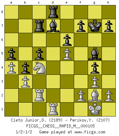Last move : 1/2-1/2 2019 June 7 9:16:23 [Event "FICGS__CHESS__RAPID_M__000105"] [Site "FICGS"] [Date "2019.05.11"] [Round "1"] [White "Cleto Junior,Dirceu"] [Black "Perikov,Yuriy"] [Result "1/2-1/2"] [WhiteElo "2189"] [BlackElo "2107"] 1.d4 d5 2.c4 e6 3.Nf3 Nf6 4.g3 Be7 5.Bg2 O-O 6.O-O dxc4 7.Qc2 b5 8.a4 b4 9.Nfd2 c6 10.Nxc4 Qxd4 11.Rd1 Qc5 12.Be3 Qh5 13.Nbd2 Ng4 14.Nf3 Nxe3 15.Nxe3 a6 16.Nc4 Qc5 17.Rac1 Ra7 18.Nfe5 Bg5 19.e3 a5 20.Qd2 Be7 21.Nd3 Qh5 22.Nde5 c5 23.Bf3 Qf5 24.Kg2 g5 25.Kg1 Rc7 26.Bg2 g4 27.e4 Qg5 28.Qxg5+ Bxg5 29.Rc2 Nd7 30.Nxd7 Bxd7 31.b3 Kg7 32.e5 Rd8 1/2-1/2 Queen's gambit declined Kingside Castling by player Black (move 5) Kingside Castling by player White (move 6) This chess game ended in a draw. Follow this game move after move (download)Strategy requires thought, tactics require observation. (Max Euwe) Irgendwie scheint mir sonntags früh um 9 Uhr der Killerinstinkt verloren gegangen zu sein. (Alexej Shirov) Cada Peón es una Reina en potencia. (James Mason) A ce moment-là, je menaçais de comprendre la position ! (Clément L'Heureux) Either move or be moved. (Ezra Pound)