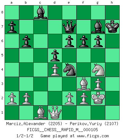Last move : 1/2-1/2 2019 May 21 10:11:46 [Event "FICGS__CHESS__RAPID_M__000105"] [Site "FICGS"] [Date "2019.05.11"] [Round "1"] [White "Marciz,Alexander"] [Black "Perikov,Yuriy"] [Result "1/2-1/2"] [WhiteElo "2205"] [BlackElo "2107"] 1.Nf3 d5 2.d4 Nf6 3.c4 e6 4.g3 Bb4+ 5.Bd2 Be7 6.Bg2 O-O 7.O-O c6 8.Qc2 b6 9.Bf4 Bb7 10.Nbd2 Nh5 11.Be3 Nd7 12.cxd5 cxd5 13.Rfc1 Bd6 14.Ne1 Nhf6 15.Nd3 Qe7 16.Nf3 Rfc8 17.Qb3 Qe8 18.Nfe5 Be7 19.h4 Ne4 20.Nxd7 Qxd7 21.Ne5 Qe8 22.Bf3 Ba6 23.Bh5 g6 24.Bg4 Kg7 25.h5 Rxc1+ 26.Rxc1 Rc8 27.hxg6 hxg6 28.Kg2 Rxc1 29.Bxc1 Bf8 30.Qe3 Kh7 31.Bf3 f6 32.Ng4 Qe7 33.Qb3 Bg7 34.Qa4 Bc8 35.Qd1 1/2-1/2 Reti Opening Kingside Castling by player Black (move 6) Kingside Castling by player White (move 7) This chess game ended in a draw. Follow this game move after move (download)He who fears an isolated Queen's Pawn should give up Chess. (Siegbert Tarrasch) Es tut gut, die Entwicklungsperiode von, [...] demokratischem Geist durchdringen zu lassen. Wie undemokratisch wäre es doch beispielsweise, den einen Offizier große Spaziertouren vornehmen zu lassen, während die anderen zu Hause säßen und sich entsetzlich langweilten. (Aaron Nimzowitsch) Si el Ajedrez es una ciencia, es la mas inexacta. Si el Ajedrez es un arte, es demasiado inexacto para ser visto como tal. Si el Ajedrez es un deporte, es demasiado esotérico. Si el Ajedrez es un juego, es demasiado exigente para ser solo un juego. Si el Ajedrez es una aventura, es una muy demandante. Si el Ajedrez es una pasión, es una muy gratificante. Si el Ajedrez es la vida, es una muy triste. (Anónimo) Il s'avisa de me proposer d'apprendre les échecs qu'il jouait un peu... me voilà forcené des échecs. J'achète un échiquier, je m'enferme dans ma chambre, j'y passe des jours et des nuits à vouloir apprendre par cur toutes les parties. (Jean-Jacques Rousseau, Confessions) Follow your passion, and success will follow you. (Arthur Buddhold)