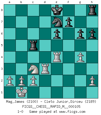 Last move : 1-0 2019 June 6 14:50:6 [Event "FICGS__CHESS__RAPID_M__000105"] [Site "FICGS"] [Date "2019.05.11"] [Round "1"] [White "Mag,James"] [Black "Cleto Junior,Dirceu"] [Result "1-0"] [WhiteElo "2100"] [BlackElo "2189"] 1.e4 c5 2.Nf3 d6 3.d4 cxd4 4.Nxd4 Nf6 5.Nc3 a6 6.Bg5 e6 7.f4 Be7 8.Qf3 g6 9.O-O-O h6 10.Bxf6 Bxf6 11.e5 Be7 12.exd6 Qxd6 13.g4 Nc6 14.Nf5 Qc7 15.Nxe7 Nxe7 16.Bg2 Bd7 17.Qxb7 Rc8 18.Qxa6 Qxf4+ 19.Kb1 Bc6 20.Bxc6+ Rxc6 21.Qa3 Qc4 22.Rhe1 Rc7 23.Re4 Qc6 24.Rd6 Qc5 25.Qxc5 Rxc5 26.Rd3 1-0 Sicilian : Najdorf, 7...Be7 Queenside Castling by player White (move 9) Player White won this chess game. Follow this game move after move (download)For me, Chess is life and every game is like a new life. Every Chess player gets to live many lives in one lifetime. (Eduard Gufeld) Mein Name ist Rustam Kamsky. Sie haben meinen Sohn belästigt. Bereiten Sie sich aufs Sterben vor. (Rustam Kamsky) A la fecha, Fischer esta simplemente un nivel arriba de todos los mejores jugadores de Ajedrez del mundo. (John Jacobs) Les écrivains ont utilisé les échecs pour analyser les côtés extrêmes de la nature humaine. Dans ce cadre, les échecs offrent un champ d'expérimentation idéal. Mais on pourrait faire la même chose avec la peinture. Et là, en vous référant à Van Gogh, vous ne tirerez pas de conclusion définitive sur les peintres. (Gary Kasparov) As a goal marker shodan is important. As a destination it is a poor place to stop. (Thomas Tamayo)