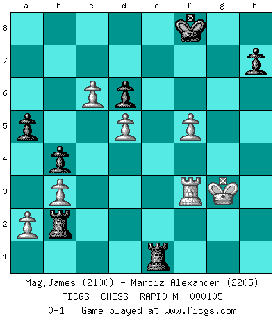 Last move : 0-1 2019 June 18 14:14:30 [Event "FICGS__CHESS__RAPID_M__000105"] [Site "FICGS"] [Date "2019.05.11"] [Round "1"] [White "Mag,James"] [Black "Marciz,Alexander"] [Result "0-1"] [WhiteElo "2100"] [BlackElo "2205"] 1.e4 c5 2.Nf3 Nc6 3.d4 cxd4 4.Nxd4 Nf6 5.Nc3 e5 6.Ndb5 d6 7.Bg5 a6 8.Na3 b5 9.Bxf6 gxf6 10.Nd5 f5 11.Bd3 Be6 12.O-O Bxd5 13.exd5 Ne7 14.Be2 Bg7 15.c4 e4 16.Qb3 b4 17.Nc2 f4 18.Rae1 O-O 19.Bd1 f5 20.f3 e3 21.Be2 a5 22.c5 Kh8 23.c6 Be5 24.Kh1 Rf6 25.Bc4 Rh6 26.Re2 Qe8 27.Ne1 Qh5 28.g4 fxg3 29.f4 Bd4 30.Qc2 Ng8 31.Rg2 Nf6 32.Be2 Ng4 33.Bxg4 fxg4 34.f5 e2 35.Qxe2 Re8 36.Qc2 Bf2 37.Rgxf2 gxf2 38.Qxf2 Qh3 39.Qg2 Qh4 40.Qd2 g3 41.Nf3 Qg4 42.b3 Re7 43.Qb2+ Rg7 44.Qg2 Rf7 45.Qb2+ Kg8 46.Qg2 Kf8 47.Qb2 Re7 48.Qd2 Rh3 49.Qb2 Qxf3+ 50.Rxf3 Re1+ 51.Kg2 Rxh2+ 52.Kxg3 Rxb2 0-1 Sicilian : Pelikan (Lasker/Sveshnikov) variation Kingside Castling by player White (move 12) Kingside Castling by player Black (move 18) Player Black won this chess game. Follow this game move after move (download)Fischer wanted to give the Russians a taste of their own medicine. (Larry Evans) Im Schach gewinnt jeder. Hat man Freunde am Spiel - und das ist die Hauptsache - ist auch der Verlust einer Partie kein Unglück. (David Bronstein) El jugador de combinación piensa hacia adelante; comienza de la posición dada y trabaja las movidas contundentes en su mente. (Emanuel Lasker) Karpov est une pièce de musée. (Garry Kasparov) Rules and bones are meant to be broken. (Anonymous)