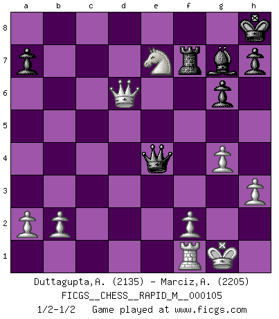 Last move : 1/2-1/2 2019 July 6 18:48:57 [Event "FICGS__CHESS__RAPID_M__000105"] [Site "FICGS"] [Date "2019.05.11"] [Round "1"] [White "Duttagupta,Aniruddha"] [Black "Marciz,Alexander"] [Result "1/2-1/2"] [WhiteElo "2135"] [BlackElo "2205"] 1.e4 c5 2.Nf3 Nc6 3.Bb5 g6 4.Bxc6 bxc6 5.O-O Bg7 6.Re1 Qc7 7.h3 d6 8.c3 Rb8 9.d4 cxd4 10.cxd4 Nf6 11.Nc3 O-O 12.Qe2 c5 13.e5 Nh5 14.exd6 exd6 15.Nd5 Qb7 16.Ne7+ Kh8 17.g4 Nf6 18.Bf4 Be6 19.Bxd6 cxd4 20.Nxd4 Rbd8 21.Nxe6 fxe6 22.Qxe6 Rxd6 23.Qxd6 Ne4 24.Rxe4 Qxe4 25.Rf1 Rf7 1/2-1/2 Sicilian : Nimzovich-Rossolimo attack (with ...g6, without ...d6) Kingside Castling by player White (move 5) Kingside Castling by player Black (move 11) This chess game ended in a draw. Follow this game move after move (download)Personally, I rather look forward to a computer program winning the world Chess Championship. Humanity needs a lesson in humility. (Richard Dawkings) Im Internet Chess Club betrug mein Rating vorübergehend 3350 ELO-Punkte. (Sergej Karjakin) Para mi, el Ajedrez es la vida y cada partida es como una nueva vida. Todo jugador de Ajedrez suele vivir muchas vidas durante su vida. (Eduard Gufeld) Les Echecs ont trois composantes : le temps, l'espace et le matériel en dernier. (Mikhail Tal) Wipe them out. All of them. (Darth Sidious in Star Wars ep.1)