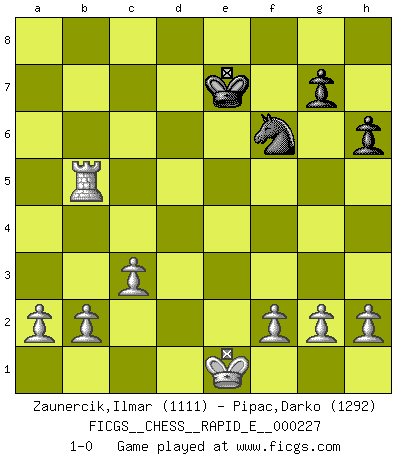 Last move : 1-0 2019 June 9 11:26:27 [Event "FICGS__CHESS__RAPID_E__000227"] [Site "FICGS"] [Date "2019.05.13"] [Round "1"] [White "Zaunercik,Ilmar"] [Black "Pipac,Darko"] [Result "1-0"] [WhiteElo "1111"] [BlackElo "1292"] 1.e4 e5 2.Nf3 Nc6 3.Bb5 d6 4.O-O Bg4 5.c3 Nf6 6.d3 h6 7.Nbd2 Qd7 8.d4 a6 9.Ba4 Bxf3 10.Nxf3 b5 11.Bb3 Nxe4 12.Re1 Nf6 13.dxe5 dxe5 14.Nxe5 Qxd1 15.Bxf7+ Ke7 16.Nxc6+ Kxf7 17.Rxd1 Re8 18.Kf1 Bc5 19.Bf4 Bd6 20.Bxd6 cxd6 21.Rxd6 Re6 22.Nd8+ Ke7 23.Rxe6+ Kxd8 24.Rd1+ Kc7 25.Rxa6 Re8 26.Re1 Rxe1+ 27.Kxe1 Kd7 28.Rb6 Ke7 29.Rxb5 1-0 Ruy Lopez : Old Steinitz defense Kingside Castling by player White (move 4) Player White won this chess game. Follow this game move after move (download)I prefer to lose a really good game than to win a bad one. (David Levy) Ich hatte Zahnschmerzen im ersten Spiel. In der zweiten Partie tat mir der Kopf weh. In der dritten war es eine Rheuma-Attacke und während der vierten fühlte ich mich nicht gut. Und in der fünften? Nun, man muss doch nicht jedes Spiel gewinnen, oder? (Savielly Grigorievitsch Tartakower) El Ajedrez es un expediente tonto que hace creer a la gente inactiva que hacen una cosa muy astuta cuando solamente estan perdiendo su tiempo. (George Bernard Shaw) Fischer est le meilleur joueur du monde et Karpov n'est qu'un joueur de bistrot. (Garry Kasparov, agé de 16 ans) In my experience, there's no such thing as luck. (Obi-Wan Kenobi in Star Wars ep.4)