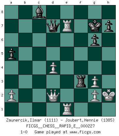 Last move : 1-0 2019 June 10 17:57:50 [Event "FICGS__CHESS__RAPID_E__000227"] [Site "FICGS"] [Date "2019.05.13"] [Round "1"] [White "Zaunercik,Ilmar"] [Black "Joubert,Hennie"] [Result "1-0"] [WhiteElo "1111"] [BlackElo "1385"] 1.e4 c5 2.Nf3 e6 3.c3 Nc6 4.Bb5 Nge7 5.d3 a6 6.Ba4 b5 7.Bc2 g6 8.O-O Bg7 9.Be3 d6 10.Nbd2 O-O 11.Re1 Bb7 12.Nf1 Rc8 13.Ng3 b4 14.d4 bxc3 15.bxc3 cxd4 16.cxd4 d5 17.e5 f6 18.exf6 Bxf6 19.Qd2 Qd7 20.Re2 a5 21.Bh6 Rf7 22.Rae1 Nd8 23.Ng5 Bxg5 24.Bxg5 Nf5 25.Bxd8 Rxd8 26.Rxe6 Nxg3 27.hxg3 Rdf8 28.f3 Qc7 29.Kh2 Bc8 30.R6e5 Qd7 31.Bb3 Rxf3 32.Bxd5+ Kh8 33.Bxf3 Rxf3 34.Re8+ Kg7 35.R8e7+ 1-0 Sicilian defense Kingside Castling by player White (move 8) Kingside Castling by player Black (move 10) Player White won this chess game. Follow this game move after move (download)Not all artists are Chess players, but all Chess players are artists. (Marcel Duchamp) Lisa Lane, amerikanische Schachmeisterin, hatte Fischer einmal als stärksten lebenden Spieler bezeichnet. Antwort: Das ist richtig, aber Lisa Lane ist eigentlich nicht in der Lage, das zu beurteilen. (Robert James Fischer) Ciertamente, de todas la drogas del mundo, el Ajedrez debe ser el mas placentero permamentemente. (Assiac) Roi des jeux et jeu des rois, les échecs portent en eux un sentiment d'infini. Ils donnent à celui qui s'est efforcé d'en approfondir les arcanes l'impression de n'être pas à la mesure de l'homme; en fait, ils constituent un résumé de l'univers, un microcosme, et figurent cette grande échelle qui, dans les plans de la lumière descend jusqu'à la matière, qui des abîmes insondables remonte jusqu'en l'infini de Dieu. (Pyrame) Even the best needles are not sharp at both ends. (Chinese proverb)