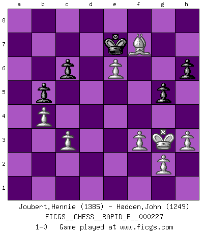 Last move : 1-0 2019 August 13 20:34:38 [Event "FICGS__CHESS__RAPID_E__000227"] [Site "FICGS"] [Date "2019.05.13"] [Round "1"] [White "Joubert,Hennie"] [Black "Hadden,John"] [Result "1-0"] [WhiteElo "1385"] [BlackElo "1249"] 1.e4 e5 2.Nf3 Nc6 3.Bc4 h6 4.d4 d6 5.dxe5 dxe5 6.Qxd8+ Kxd8 7.Bxf7 Nf6 8.Nbd2 Bc5 9.O-O Rf8 10.Bb3 Bd7 11.h3 Nd4 12.Nxe5 c6 13.c3 Ne2+ 14.Kh2 Nf4 15.Nxd7 Kxd7 16.f3 Kc7 17.Nc4 Rad8 18.Bxf4+ Kc8 19.Rfd1 Rxd1 20.Rxd1 b5 21.Nd6+ Bxd6 22.Bxd6 Re8 23.Bg3 Kb7 24.Bf7 Re7 25.Bg6 Kb6 26.b4 a5 27.a3 axb4 28.axb4 Kb7 29.Bf5 g5 30.Rd6 Ne8 31.Re6 Rxe6 32.Bxe6 Nc7 33.Bxc7 Kxc7 34.Kg3 Kd6 35.Bf7 Kd7 36.e5 Ke7 37.e6 1-0 King's pawn game Kingside Castling by player White (move 9) Player White won this chess game. Follow this game move after move (download)In a gambit you give up a Pawn for the sake of getting a lost game. (Samuel Standige Boden) Kritik überlasse ich den Spießern. Ich zeige nichts, wofür ich mich schämen muss. (Alexandra Kosteniuk) Cuando tengas duda... ¡juega al Ajedrez!. (Tevis) Des points faibles ou des trous dans la position de l'adversaire doivent être occupés par des pièces et non pas par des pions. (Siegbert Tarrasch) There are lots of people who mistake their imagination for their memory. (Josh Bilings)