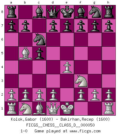 Last move : 1-0 2007 July 24 0:26:35 [Event "FICGS__CHESS__CLASS_D__000050"] [Site "FICGS"] [Date "2007.06.12"] [Round "1"] [White "Kolok,Gabor"] [Black "Bakirhan,Recep"] [Result "1-0"] [WhiteElo "1600"] [BlackElo "1600"] 1.e4 c5 2.Nf3 Nc6 3.Bb5 1-0 This chess game has been lost on time (started : 2007.06.12 1:10:41) Sicilian : Nimzovich-Rossolimo attack (without ...d6) Player White won this chess game. Follow this game move after move (download)All I want to do, ever, is just play Chess. (Bobby Fischer) Weshalb minderdergeübte Spieler mit g2-g4 beginnen? Die betreffenden sind unschlüssig, ob sie nun rechts (h4) oder links (f4) beginnen sollen, und in ihrer Ratlosigkeit entschliessen sie sich nach guter Bürgerart dazu, den goldenen Mittelweg zu wählen. (Aaron Nimzowitsch) Tu cuerpo tiene que estar en óptima condición. Tu Ajedrez se deteriora como lo hace tu cuerpo. No puedes separar la mente y el cuerpo. (Bobby Fischer) Aucun coup ne doit être joué sans but. (Pedro Damiano) Some people are so afraid to die that they never begin to live. (Henry Van Dyke)