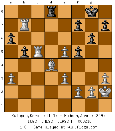 Last move : 1-0 2019 July 24 10:27:17 [Event "FICGS__CHESS__CLASS_F__000216"] [Site "FICGS"] [Date "2019.05.13"] [Round "1"] [White "Kalapos,Karol"] [Black "Hadden,John"] [Result "1-0"] [WhiteElo "1143"] [BlackElo "1249"] 1.d4 d5 2.c4 c6 3.e3 Nf6 4.Nc3 Bd7 5.Nf3 e6 6.Bd3 Bb4 7.Qc2 Qc7 8.O-O Bxc3 9.bxc3 c5 10.Re1 cxd4 11.cxd4 a6 12.Qe2 Bc6 13.Bb2 O-O 14.Rac1 Nbd7 15.Ne5 dxc4 16.Nxc4 b5 17.Ne5 Nxe5 18.dxe5 Nd7 19.Qh5 g6 20.Qg5 Qb7 21.Qg3 Rfd8 22.Be2 Nc5 23.Rxc5 Rd5 24.Rc2 Rad8 25.Bd4 R5d7 26.a3 Rd5 27.Bf3 Qd7 28.Bxd5 Qxd5 29.Rec1 Bb7 30.Rc5 Qd7 31.Rc7 Qd5 32.R1c5 Qb3 33.h3 Qd1+ 34.Kh2 Qh5 35.Qf4 Qf5 36.Qxf5 exf5 37.Rxb7 1-0 QGD Slav defense Kingside Castling by player White (move 8) Kingside Castling by player Black (move 13) Player White won this chess game. Follow this game move after move (download)The enormous mental resilience, without which no Chess player can exist, was so much taken up by Chess that he could never free his mind of this game. (Albert Einstein) Den Ruhm habe ich schon, jetzt brauche ich noch das Geld. (Wilhelm Steinitz) Fischer era un maestro de claridad y un Rey del posicionamiento astuto. Sus oponentes podían ver hacia donde se dirigía pero eran impotentes para detenerlo. (Bruce Pandolfini) On peut tirer plus d'utilité d'une partie perdue que de 100 parties gagnées. (Capablanca) There are two major products that came out of Berkeley: LSD and UNIX. We do not believe this is to be a coincidence. (Jeremy S. Anderson)