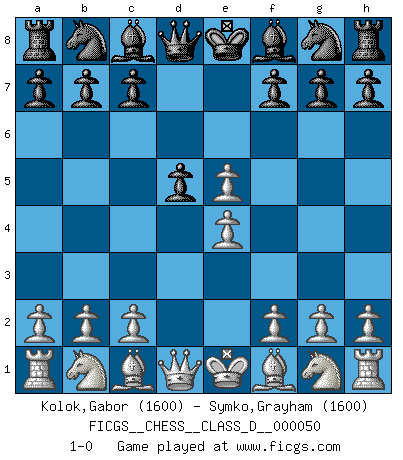 Last move : 1-0 2007 July 23 18:23:35 [Event "FICGS__CHESS__CLASS_D__000050"] [Site "FICGS"] [Date "2007.06.12"] [Round "1"] [White "Kolok,Gabor"] [Black "Symko,Grayham"] [Result "1-0"] [WhiteElo "1600"] [BlackElo "1600"] 1.e4 e5 2.d4 d5 3.dxe5 1-0 This chess game has been lost on time (started : 2007.06.12 1:10:41) King's pawn game Player White won this chess game. Follow this game move after move (download)The enormous mental resilience, without which no Chess player can exist, was so much taken up by Chess that he could never free his mind of this game. (Albert Einstein) Kostenjuk hat keinen Sexappeal. (Loek van Wely) Debió haber existido una vez en que los hombres eran semidióses, de otra manera no hubiesen podido inventar el Ajedrez. (Gustav Schenk) La conception d'un plan est le processus par lequel un joueur exploite les avantages de sa position tout en s'efforçant d'en réduire au minimum les inconvénients. Afin de garantir le succès, un plan doit toujours se fonder sur un diagnostic objectif des particularités d'une position. La conception d'un plan est d'autant plus difficile que la position est équilibrée, et grandement facilitée lorsqu'il n'existe qu'un seul plan susceptible de répondre aux exigences de la position. (Harry Golombek) Hello Thibault, if I have had a plan (and I had one, I hope), I have forgotten it during the last week... - Hello Heinz-Georg. What do you mean a plan ? (Anonymous players, during a Big Chess game)