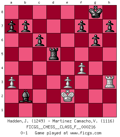 Last move : 0-1 2019 September 22 22:13:21 [Event "FICGS__CHESS__CLASS_F__000216"] [Site "FICGS"] [Date "2019.05.13"] [Round "1"] [White "Hadden,John"] [Black "Martinez Camacho,Victor Hugo"] [Result "0-1"] [WhiteElo "1249"] [BlackElo "1116"] 1.d4 e6 2.c4 d5 3.cxd5 exd5 4.Nc3 Nf6 5.Nf3 Nc6 6.e3 Bd6 7.Bd2 Bg4 8.Be2 O-O 9.h3 Bh5 10.g4 Bg6 11.Bc1 Nb4 12.a3 Nc2+ 13.Kf1 Nxa1 14.Bd3 Bxd3+ 15.Qxd3 Nb3 16.Qc2 Na5 17.Bd2 Nc4 18.Nxd5 Nxd2+ 19.Qxd2 Ne4 20.Qd3 Re8 21.Nc3 Nxc3 22.Qxc3 c6 23.Kg2 Rc8 24.Rc1 Re7 25.Qd3 Re6 26.Qf5 Rf6 27.Qd3 Bb8 28.Ng5 g6 29.h4 Qd6 30.Ne4 Qe6 31.Nxf6+ Qxf6 32.Rh1 Re8 33.Rh3 Qd6 34.Qe2 Qxd4 35.Rf3 Qxg4+ 36.Kf1 Qxh4 37.Ke1 Rd8 38.Qf1 Rd7 39.Qh3 Qxh3 40.Rxh3 Rd5 41.Ke2 Be5 42.f4 Bxb2 0-1 Queen's pawn Kingside Castling by player Black (move 8) Player Black won this chess game. Follow this game move after move (download)A thorough understanding of the typical mating continuations makes the most complicated sacrificial combinations leading up to them not only not difficult, but almost a matter of course. (Siegbert Tarrasch) Alle Schachspieler sollten auch ein Hobby haben. (Savielly Grigorievitsch Tartakower) No hay precio que sea tan grande por la cabellera del Rey enemigo. (Koblentz) Les Echecs représentent une sphère d'idées créatrices basée sur la volonté des deux protagonistes. (Smyslov) The various flowers seem good to different people. (Chinese proverb)