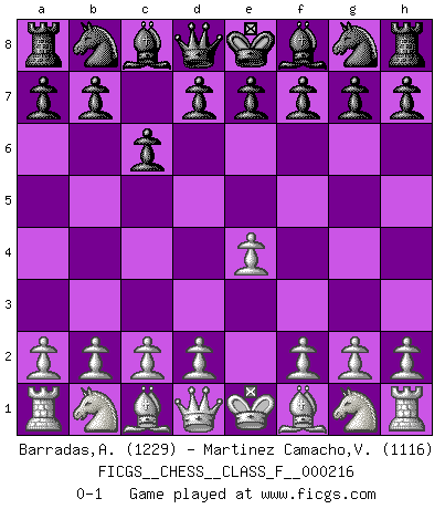 Last move : 0-1 2019 June 23 8:2:56 [Event "FICGS__CHESS__CLASS_F__000216"] [Site "FICGS"] [Date "2019.05.13"] [Round "1"] [White "Barradas,Anderson"] [Black "Martinez Camacho,Victor Hugo"] [Result "0-1"] [WhiteElo "1229"] [BlackElo "1116"] 1.e4 c6 0-1 This chess game has been lost on time (started : 2019.05.13 15:5:6) Caro-Kann defense Player Black won this chess game. Follow this game move after move (download)I play correspondence chess because it is both art and science while chess is art only. (A player at FICGS) Die starken Figuren des Gegners muss man abtauschen. (José Raúl Capablanca) El Ajedrez demanda una total concentración. (Bobby Fischer) Même si l'adversaire joue le coup analysé précédemment, recommencez l'analyse en voyant la nouvelle position. Première règle de Blumenfeld Programmer - an organism that turns coffee into software. (Anonymous)