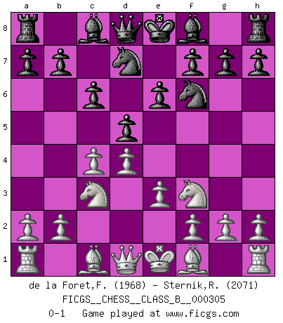 Last move : 0-1 2019 June 25 12:0:43 [Event "FICGS__CHESS__CLASS_B__000305"] [Site "FICGS"] [Date "2019.05.13"] [Round "1"] [White "de la Foret,Fred"] [Black "Sternik,Ryszard"] [Result "0-1"] [WhiteElo "1968"] [BlackElo "2071"] 1.d4 Nf6 2.c4 e6 3.Nf3 d5 4.Nc3 c6 5.e3 Nbd7 0-1 This chess game has been lost on time (started : 2019.05.13 22:12:30) Queen's pawn game Player Black won this chess game. Follow this game move after move (download)Chess problems demand from the composer the same virtues that characterize all worthwhile art: originality, invention, conciseness, harmony, complexity, and splendid insincerity. (Vladimir Nabokov) Zu meiner Zeit war ein 20 jähriger ein junger Spieler, heute ist er ein Veteran. (Garry Kasparov) Si pudieramos observar el interior de la cabeza de un jugador de Ajedrez, encontraríamos ahí un mundo lleno de sentimientos, imágenes, ideas, emoción y pasión. (Alfred Binet) Votre seul travail dans les ouvertures est d'obtenir un milieu de partie jouable. (Lajos Portish) A cynic is a man who knows the price of everything but the value of nothing. (Oscar Wilde)