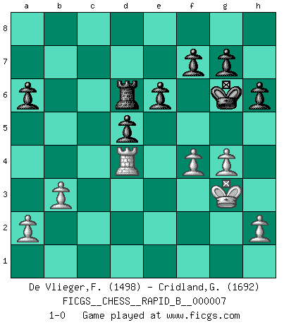Last move : 1-0 2006 September 14 6:51:7 [Event "FICGS__CHESS__RAPID_B__000007"] [Site "FICGS"] [Date "2006.06.14"] [Round "1"] [White "De Vlieger,Filip"] [Black "Cridland,Graham"] [Result "1-0"] [WhiteElo "1498"] [BlackElo "1692"] 1.e4 c5 2.Nf3 d6 3.Bb5+ Bd7 4.Bxd7+ Nxd7 5.d4 cxd4 6.Nxd4 Ngf6 7.Nc3 Rc8 8.O-O Rxc3 9.bxc3 Nxe4 10.Qf3 Ndf6 11.Re1 d5 12.Bf4 e6 13.Rab1 Qd7 14.Rb3 Bd6 15.Be3 O-O 16.Reb1 b6 17.Rd1 Rc8 18.Nb5 Bb8 19.Bd4 a6 20.Bxf6 Nxf6 21.Nd4 b5 22.Qe2 Ne4 23.Nxb5 Nc5 24.Nd4 Nxb3 25.cxb3 Qd6 26.g3 Rxc3 27.f4 Ba7 28.Kg2 h6 29.Qd2 Qc5 30.Kh3 Qxd4 31.Qxd4 Bxd4 32.Rxd4 Rc6 33.Ra4 Rd6 34.Rd4 Kh7 35.g4 Kg6 36.Kg3 1-0 This chess game has been lost on time (started : 2006.06.14 16:23:15) Sicilian : Canal-Sokolsky attack, 3...Bd7 Kingside Castling by player White (move 8) Kingside Castling by player Black (move 15) Player White won this chess game. Follow this game move after move (download)A sacrifice is best refuted by accepting it. (Wilhelm Steinitz) Modernes Schach sorgt sich zuviel um Dinge wie Bauernstruktur usw. Vergessen Sie das, Schachmatt beendet das Spiel! (Nigel Short) Tu eres para mi la Reina en d8 y yo soy el Peón en d7!!. (GM Eduard Gufeld) Le temps de noter son nom sur la feuille de partie, j'étais déjà en zeitnot ! D'un modeste amateur apparié lors de la première ronde d'un open contre le grand-maître Azmaïparashvili. If you have any trouble condescending, find a Unix user to show you how it's done. (Scott Adams)