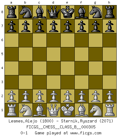 Last move : 0-1 2019 June 23 8:2:56 [Event "FICGS__CHESS__CLASS_B__000305"] [Site "FICGS"] [Date "2019.05.13"] [Round "1"] [White "Lesmes,Alejo"] [Black "Sternik,Ryszard"] [Result "0-1"] [WhiteElo "1800"] [BlackElo "2071"] 0-1 This chess game has been lost on time (started : 2019.05.13 22:12:30) Player Black won this chess game. Follow this game move after move (download)If one piece is badly posted, the whole game is bad. (Tarrasch) Ja, jede Frau in Holland liebt mich bestimmt, und alle Männer hassen mich. (Loek van Wely) Solo los afeminados hacen el Enroque. (Rob Sillars) On croit qu'il y a plus de mauvais joueurs que de bons joueurs, c'est faux : Il y a autant de joueurs qui gagnent que de joueurs qui perdent. (Philippe Geluck) The weakness of an artist is dogma. (Josh Waitzkin)